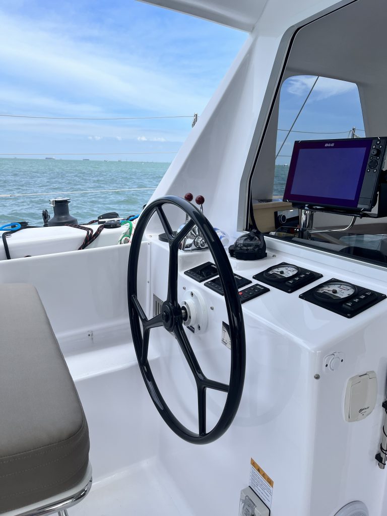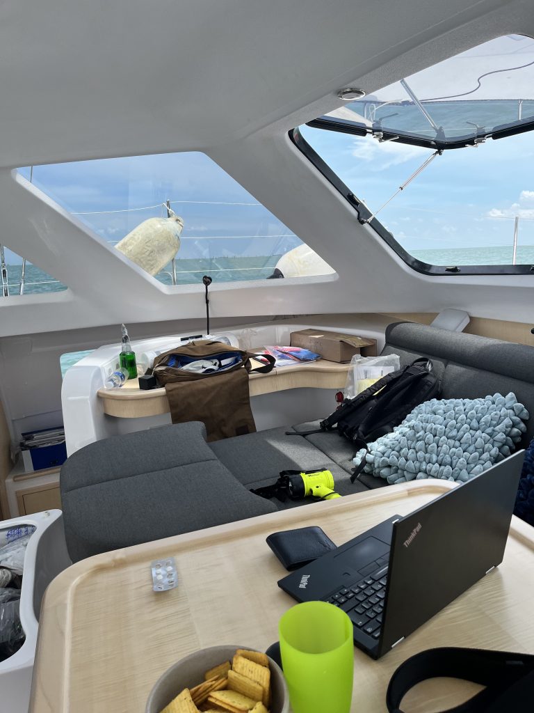 Dann gehtâs auch schon los. Mike erklĂ€rt die Technik an Bord, in erster Linie Klaus, ich versuche zu folgen, dabei wird mir erstmal schlecht. đ€ą Ich schnappe mir schnell eine Tablette gegen Ăbelkeit, die groĂzĂŒgig auf dem Tisch herumliegen. Stunde um Stunde krabbeln Klaus und Mike in alle möglichen Luken und sprechen ĂŒber die sehr umfangreiche Technik. Mir raucht schon beim Zuhören der Kopf. đ€Ż Gegen 13:00 Uhr gibtâs einen kleinen, feinen Lunch, den Annie toll vorbereitet hat. Dann geht es auch schon weiter. Charger, Batterien, Sicherungen, Filtersysteme, Motoren, Klimaanlage, Gaskochfelder, Backofen, Mikrowelle, Waschmaschine, Toilettensysteme und sooo viel mehr⊠Dann, Sonnenuntergang, schnell die Kissenauflagen an Deck, alle etwas zu Trinken in die Hand und anstoĂen. đ» Kiwanc fĂ€hrt uns mit dem Beiboot wieder an Land (dieses Mal bleiben wir trocken) und gehen zurĂŒck in unser Hotel. Hier ist die Arbeit aber noch lĂ€ngst nicht fertig, denn Klaus muss unser Satellitentelefon zum Leben erwecken und programmieren. Die Simcard, die dafĂŒr benötigt wird, ist eine lĂ€ngere Odyssee. So viel zu heute und morgen gehen wir segeln.