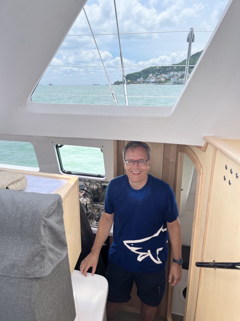 Heute geht es besonders zeitig zum FrĂŒhstĂŒck denn, kurz nach 8:00 Uhr ist Treffen mit Mike und Annie angesagt. Das erste Handover steht an. Das heiĂt, wir lernen Yuti richtig kennen. Kiwanc holt uns mit dem Dinghy vom Strand ab. Der Wind und die Wellen sind heute stĂ€rker, und so sind wir alle bis zur GĂŒrtellinie klitsch nass als wir Yuti erreichen. Egal! Wir lernen An kennen, den Vietnamesen, der uns nach Singapur begleiten wird. Netter Kerl. Auf unserem Boot herrscht lustiges Chaos. Ăberall liegt Equipment, Werkzeug, Essen, Zettel und Handys herum u n d unsere letzten drei rangeschafften Kartons wurden ausgepackt, die Inhalte irgendwo hingepackt und sogar die Dekokissen verteilt.