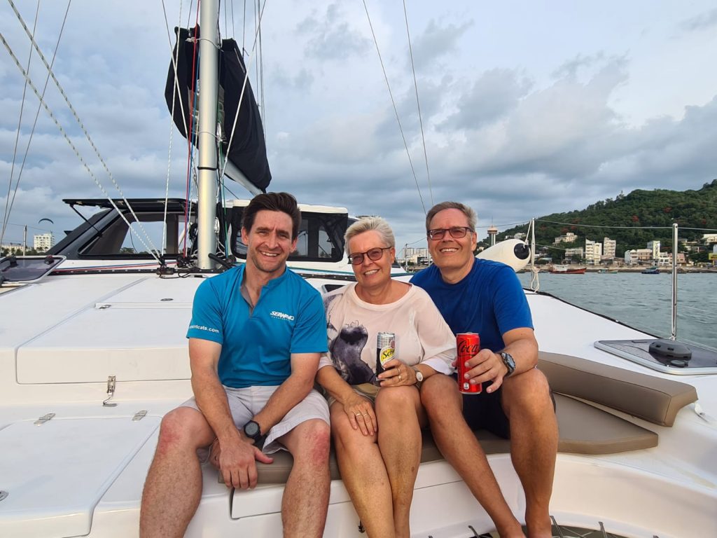 Wieder geht es frĂŒh aus dem Bett. 8:00 Uhr Treffen am Strand, Fahrt mit dem Dinghy zum Boot, wieder pitschnass, Brille mit Salzwasser versaut. 𫣠An Bord herrscht Chaos und Unordnung. Immerhin essen, arbeiten und schlafen zwei ausgewachsene MĂ€nner Tag und Nacht auf unserem Boot⊠Heute wird gesegelt und das bei starkem Wind und krĂ€ftiger Welle. Segel (GroĂ und Fog) werden gehisst, gerefft und wieder herunter gelassen. Screecher wird installiert, Anker geschmissen, Bridle ein – und ausgehĂ€ngt, Anker wieder gelichtet. Das alles bei stark schwankendem Boot. Erst Mike, dann Klaus, erwisch eine ordentliche Welle, beide sind von oben bis unter nass. Zu allem Ăberfluss, rammt sich Klaus die Verse, blutet, hat ne fette Wunde und merkt es vor lauter Konzentration gar nicht. SpĂ€ter dann schon⊠Ach, und ein Sonnenbrand ist auch noch dabei⊠đ„”. Am Ende des Tages ankern wir im stinkigen und dreckigen Industriehafen von Vung Tau. Schön ist anders! Eine BootsĂŒbergabe in Vietnam ist schon eine besondere Herausforderung. Alles leidet, Mensch und Boot. Yuti ist schon ganz dreckig. Und das Beiboot voller WasserâŠ