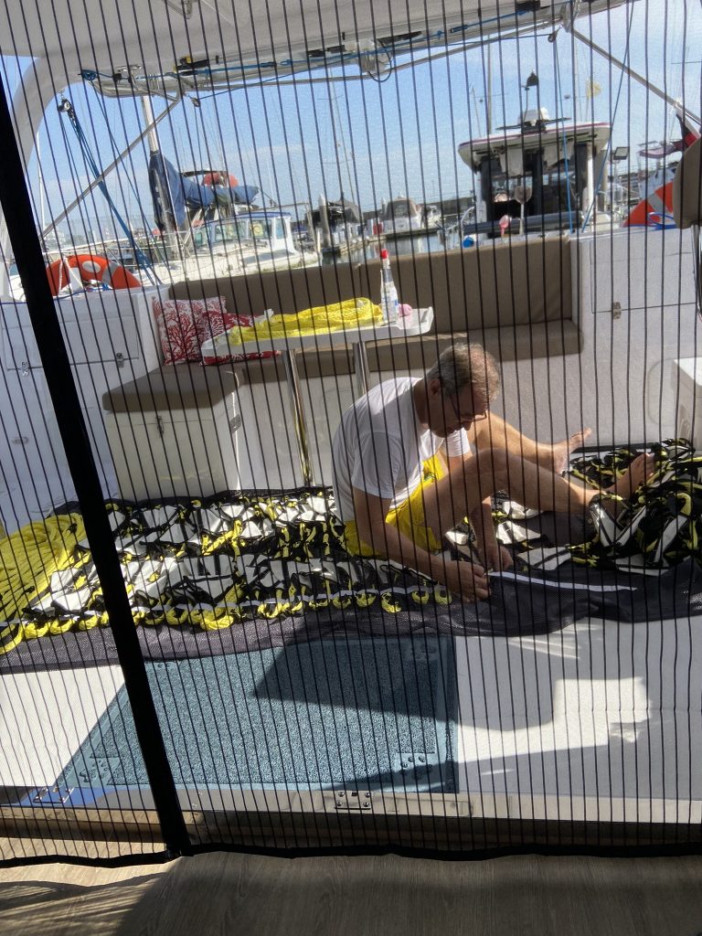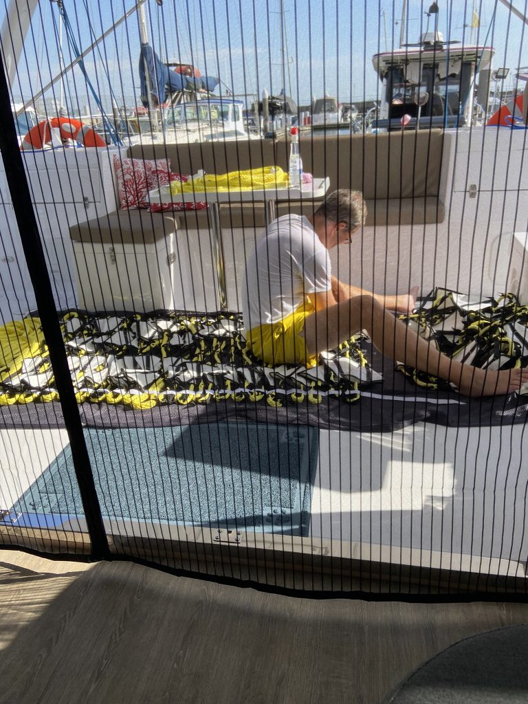 Und was machen wir heute Schönes?Heute wollen wir raus in die Natur und rein ins Dschungelvergnügen. Vergnügen? Abwarten…. Aber zuvor wird uns von einem Marino per Golfwagen, ein großes Paket bis ans Boot gebracht. Was ist da drin? Ahhh, die Drogue. Noch in Deutschland bestellt und nach Singapur in diese Marina Raffles, hat Klaus ein Sicherheitssystem schicken lassen, das nach einigen Irrungen und Wirrungen nun doch von Ups geliefert wird. Was ist das genau? Ich würde sagen, eine laaange Leine, bestückt mit lauter kleinen Fallschirmen, die beschwert mit einer Ankerkette bei seeehr starkem Sturm und seeehr hoher Welle am Heck befestigt, über Bord geschmissen wird. Die Fallschirme füllen sich mit Wasser und bremsen das Boot dann so effektiv, dass es möglichst nicht mehr in einen Wellenberg kracht und havariert. Tolle Sache…