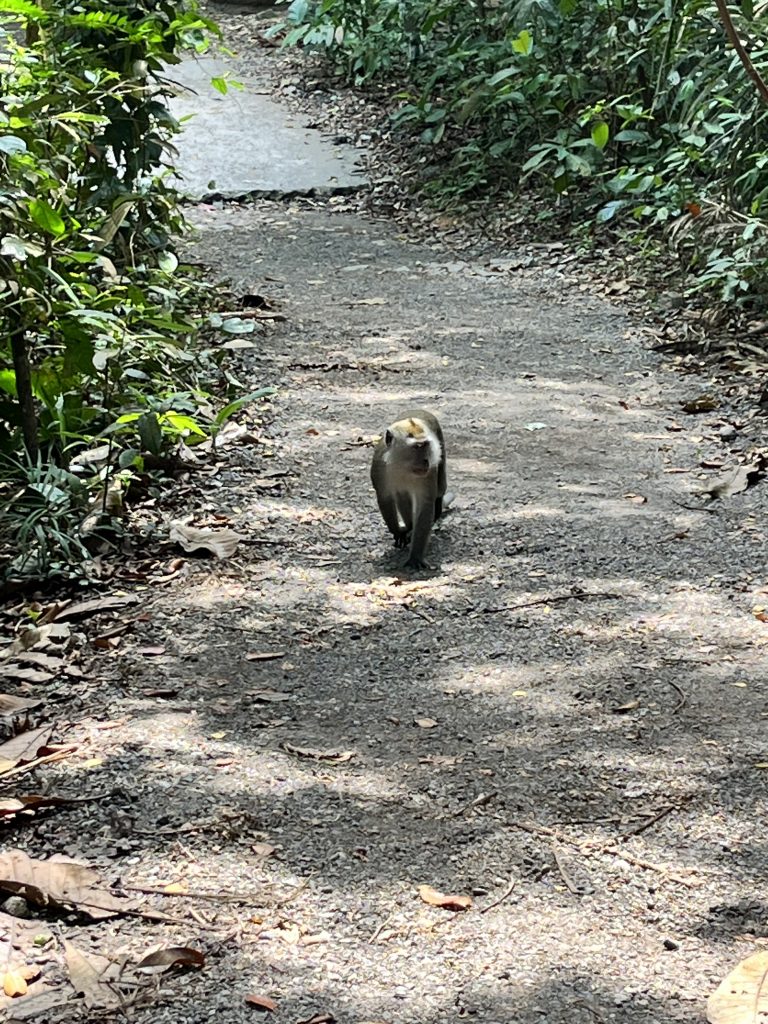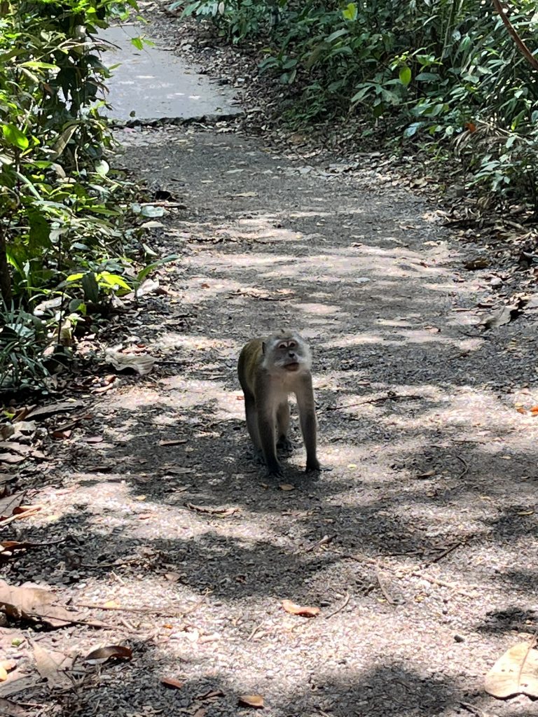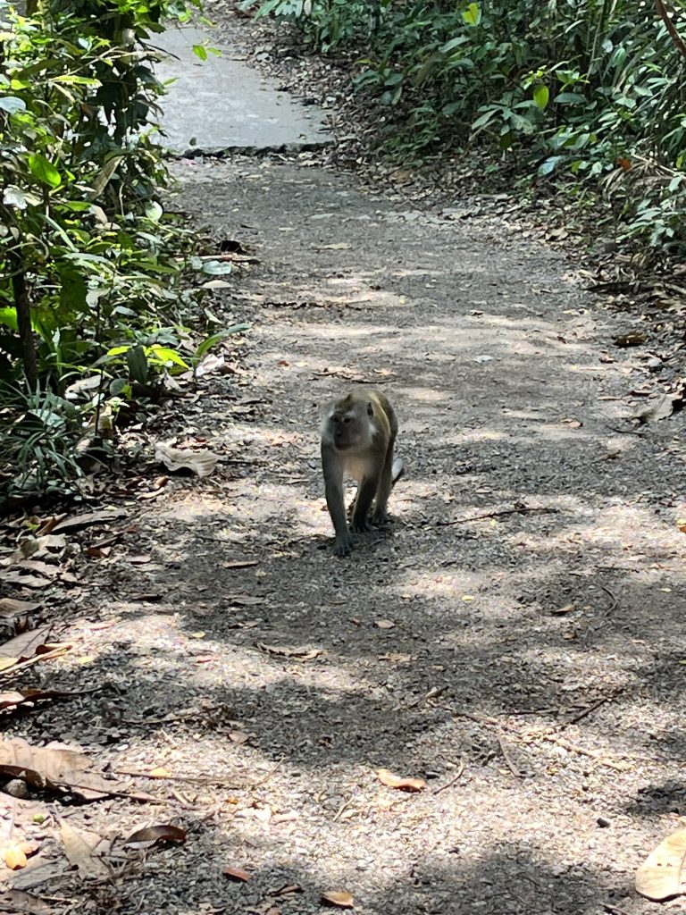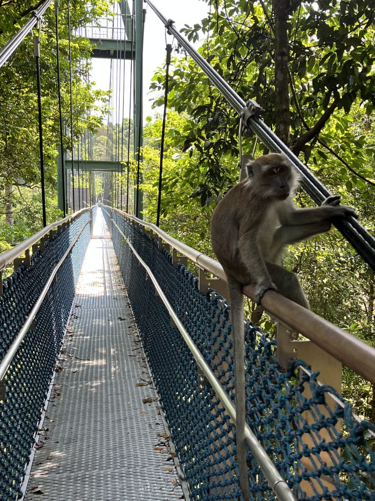 Hier knüpft und sortiert Klaus die Drogue in die dafür vorgesehene Verpackung und ist happy 😅. Ich denke bloß, noch ein sperriges Teil mehr, was verstaut werden muss. 🤪 So, und nun ab zum MacRitchie Reservoir, dem größten Naturreservoir Singapurs, um dort den Tree Top Walk zu walken 🚶🏃♂️🚶♀️🏃♀️. Nach etlichen U-Bahnstationen sind wir da und legen auch gleich los, denn es ist mittlerweile schon etwas später geworden, Mittag um genau zu sein, und wir gehen ziemlich allein in unsere Richtung. Komisch, uns kommen nur Menschen entgegen. 🤔 Ach ja, ich las, man solle dieses Unterfangen möglichst früh am Tage starten, wegen der Hitze… 🥵. Und da sind wir nun im Dschungel und werden von einem ziemlich lauten Quietschen und Pfeifen empfangen. Es ist wie, Tinitus hoch 10. Das müssen Grillen oder Zikaden sein, oder Ähnliches… auf jeden Fall laut! Wir laufen und laufen, Kilometer um Kilometer… Es ist heiß, es ist laut und nach 5 Kilometern machen sich erste Erschöpfungszeichen bei uns bemerkbar. Aber, der Weg ist gut präpariert und bestens ausgezeichnet. Wir dürfen nicht rauchen, schaffen wir locker 😉 und unsere Haustiere haben wir zum Glück auch zu Hause gelassen 😂. Ach so, wegen der Affen… und siehe da, da sind sie auch schon.