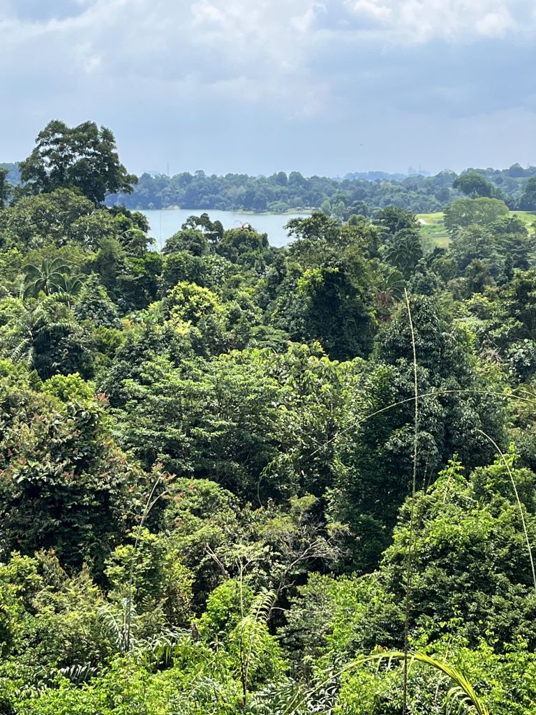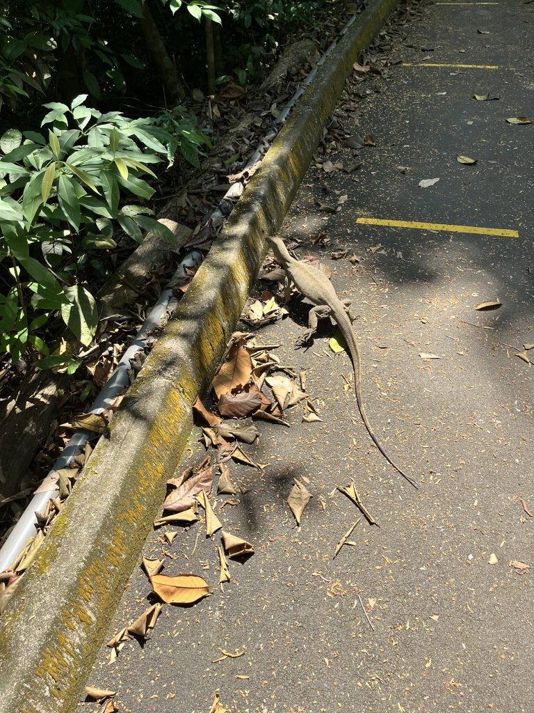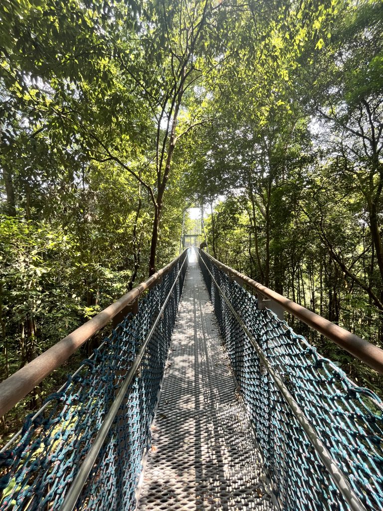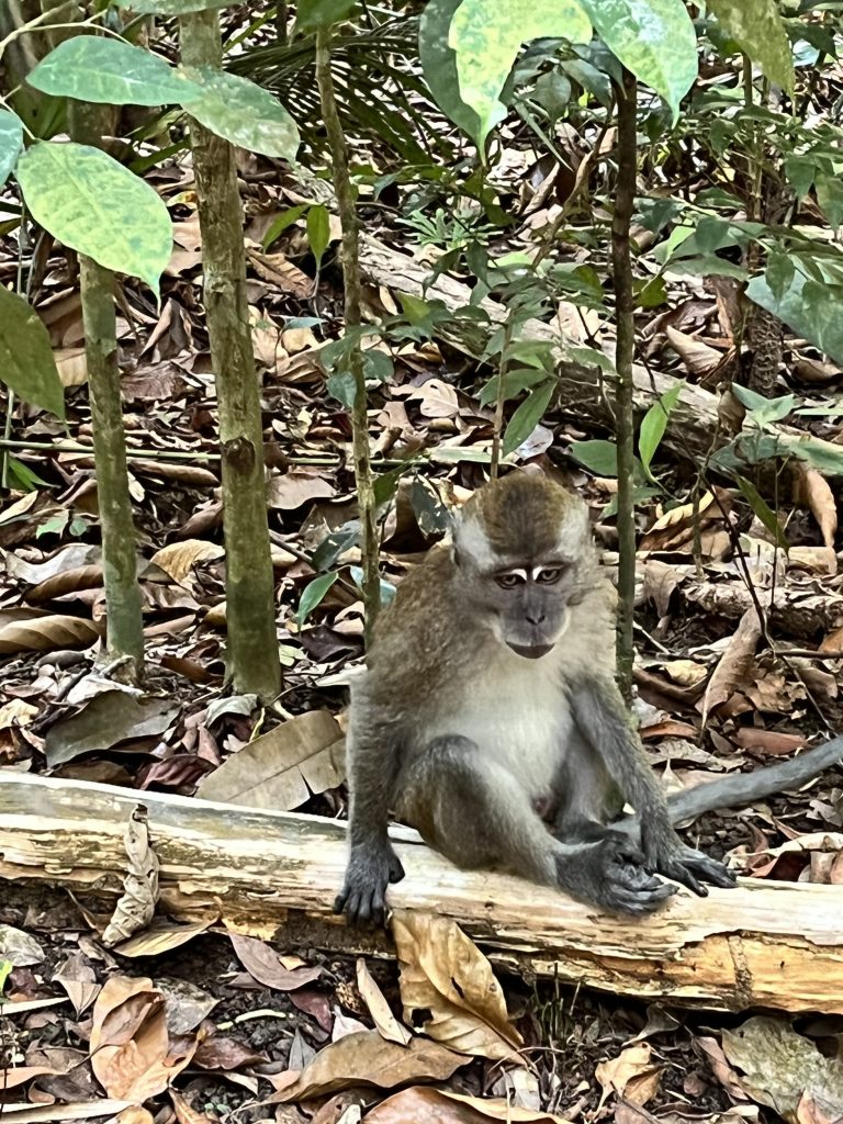 Hier knüpft und sortiert Klaus die Drogue in die dafür vorgesehene Verpackung und ist happy 😅. Ich denke bloß, noch ein sperriges Teil mehr, was verstaut werden muss. 🤪 So, und nun ab zum MacRitchie Reservoir, dem größten Naturreservoir Singapurs, um dort den Tree Top Walk zu walken 🚶🏃♂️🚶♀️🏃♀️. Nach etlichen U-Bahnstationen sind wir da und legen auch gleich los, denn es ist mittlerweile schon etwas später geworden, Mittag um genau zu sein, und wir gehen ziemlich allein in unsere Richtung. Komisch, uns kommen nur Menschen entgegen. 🤔 Ach ja, ich las, man solle dieses Unterfangen möglichst früh am Tage starten, wegen der Hitze… 🥵. Und da sind wir nun im Dschungel und werden von einem ziemlich lauten Quietschen und Pfeifen empfangen. Es ist wie, Tinitus hoch 10. Das müssen Grillen oder Zikaden sein, oder Ähnliches… auf jeden Fall laut! Wir laufen und laufen, Kilometer um Kilometer… Es ist heiß, es ist laut und nach 5 Kilometern machen sich erste Erschöpfungszeichen bei uns bemerkbar. Aber, der Weg ist gut präpariert und bestens ausgezeichnet. Wir dürfen nicht rauchen, schaffen wir locker 😉 und unsere Haustiere haben wir zum Glück auch zu Hause gelassen 😂. Ach so, wegen der Affen… und siehe da, da sind sie auch schon.