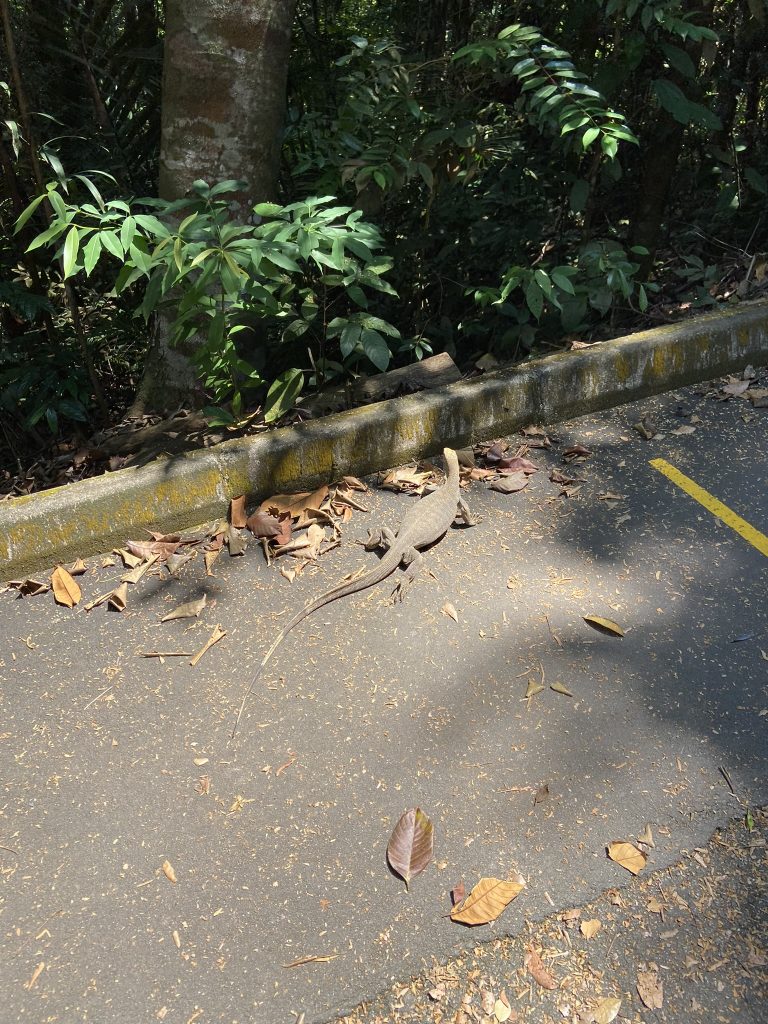 Eigentlich wollte der sich gerade gemütlich in der Sonne ausbreiten, da sind wir daher gekommen. Endlich, wir erreichen den Tree Top Walk. Ein Wegstück, dass uns direkt zu einer, nein, zu der Hängebrücke schlechthin bringt. 250 Meter lang, sehr hoch und von Affen bewacht. Und, wir dürfen nur in eine Richtung. Don‘t turn back! ! !