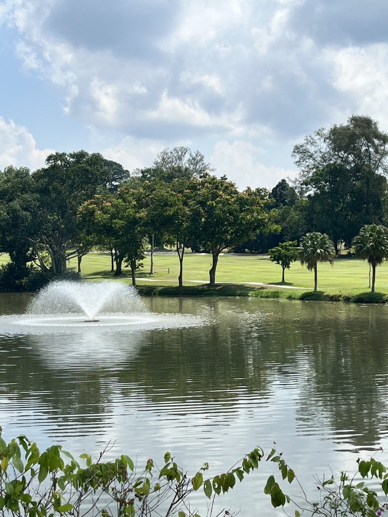 Wir laufen weiter, die Brücke schwingt, macht aber einen sehr stabilen Eindruck. Hinter der Brücke schließt sich ein Tor und es geht definitiv nicht mehr zurück. Wir müssten jetzt so an die 7 Kilometer geschafft haben und machen ein Trinkpäuschen. Zwei kleine Wasserfläschchen haben wir dabei, nicht viel bei der Hitze. Eine wird sauber geteilt und geleert. Weiter, weiter, wir haben ja erst die Hälfte des Weges geschafft. Nach einiger Zeit passieren wir eine sehr schöne Golfanlage. Witzig, links pfeift der Dschungel, rechts wird gegolft und in der Mitte laufen wir und beobachten einen großen Waran, wie er an einem riesigen Fischkopf frisst.