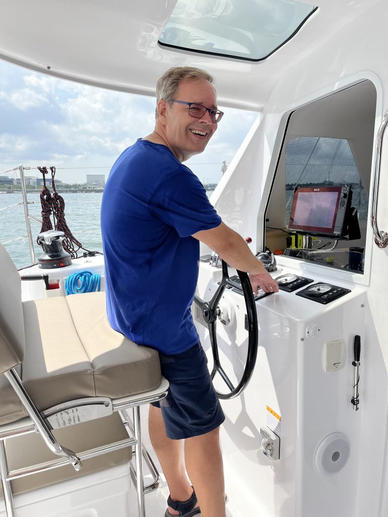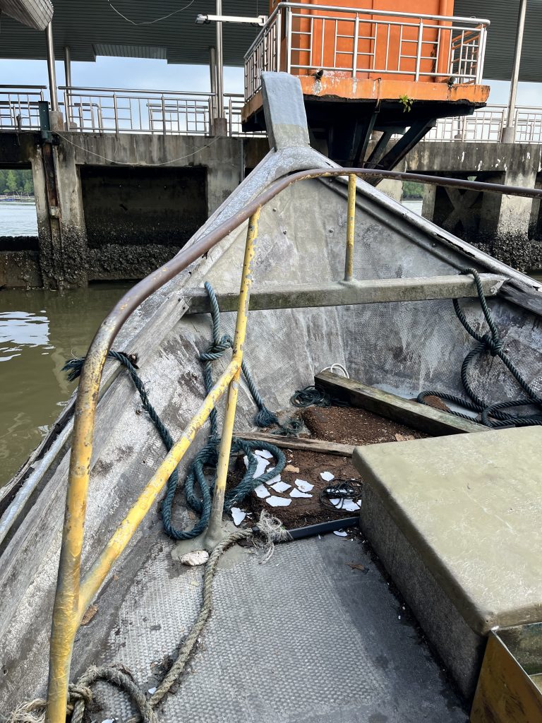 Ölwechsel? Vergessen wir den Ölwechsel. Der dauerte einen geschlagenen ganzen Tag und wir fragten uns schon, was machen die da nur??? Es wurde jedenfalls seeehr viel geschwitzt, gehustet und geschraubt und am Schluss, die Motoren liefen wieder, bat uns der Hauptmonteur, ob er uns abends mit seiner Familie noch besuchen kommen könnte… 😳 häää? Na dann bis später. Er kam mit Frau und zwei halbwüchsigen Söhnen und es wurde sehr viel gebabbelt, in einem Englisch, wo wir circa nur jedes 5. Wort verstanden haben. 🤔 Nur so viel, der ältere Sohn wollte ausschließlich über Nazi Deutschland und den 2. Weltkrieg sprechen. Das war wohl gerade Unterrichtsthema in Geschichte. Und der jüngere wollte auch viel sagen, hatte aber nen Sprachfehler und ich konnte nun gar nichts mehr verstehen… Aber ja, nach einer guten Stunde brachen sie wieder auf und wir konnten nun, bei einem Videocall, mit Larissa und Alva weiter babbeln. 😅 Übernächster Morgen, heute, Weckzeit 7:00 Uhr, ab in den Waschraum, ein letztes Mal Orangensaft aus dem Automaten holen, Fender alle auf Backbord, große Verabschiedung von Esther, die mit dem 1160er Kat, von Kun, dem Belgier mit den zwei Töchtern und dem sehr netten Marina Chef, Leinen los und ab zur Tanke. Zweimal volltanken bitte. Zwei Motoren, zwei Tanks. Nein, sie sind nicht mit einander verbunden. Beim Tank auf der Backbordseite kam ne ordentliche Fontäne wieder zurück und Klaus fast ins Gesicht. Schöner Dieselgestank 🫢. So, nun sind sie beide voll und es geht weiter zur Immigration um das Land wieder verlassen zu können. Wir warten und da kommen sie auch schon. Dieses Mal sind es 6 Polizeibeamte und nur zwei kommen auf’s Boot und Stempel gibt’s auch keine. Diesmal sollen wir stempeln. Und tatsächlich, wir haben sogar einen Stempel. Nen Yuti Stempel. 🤗 Nun ist das Procedere geschafft, zum dritten Mal heißt es Leinen los und ab nach Malaysia.