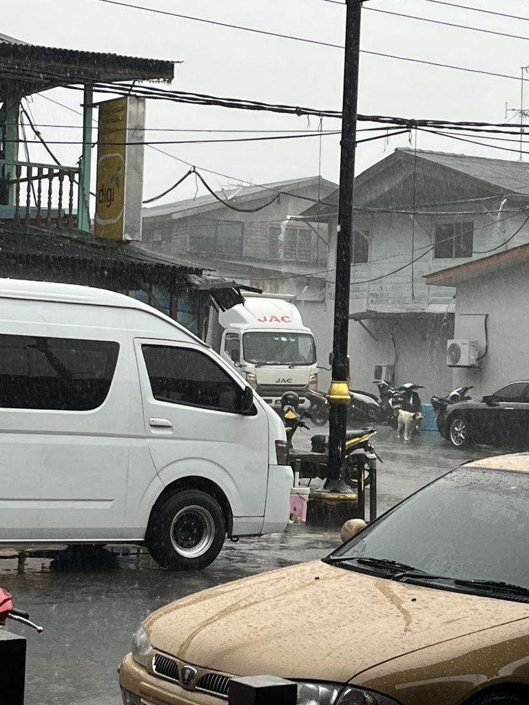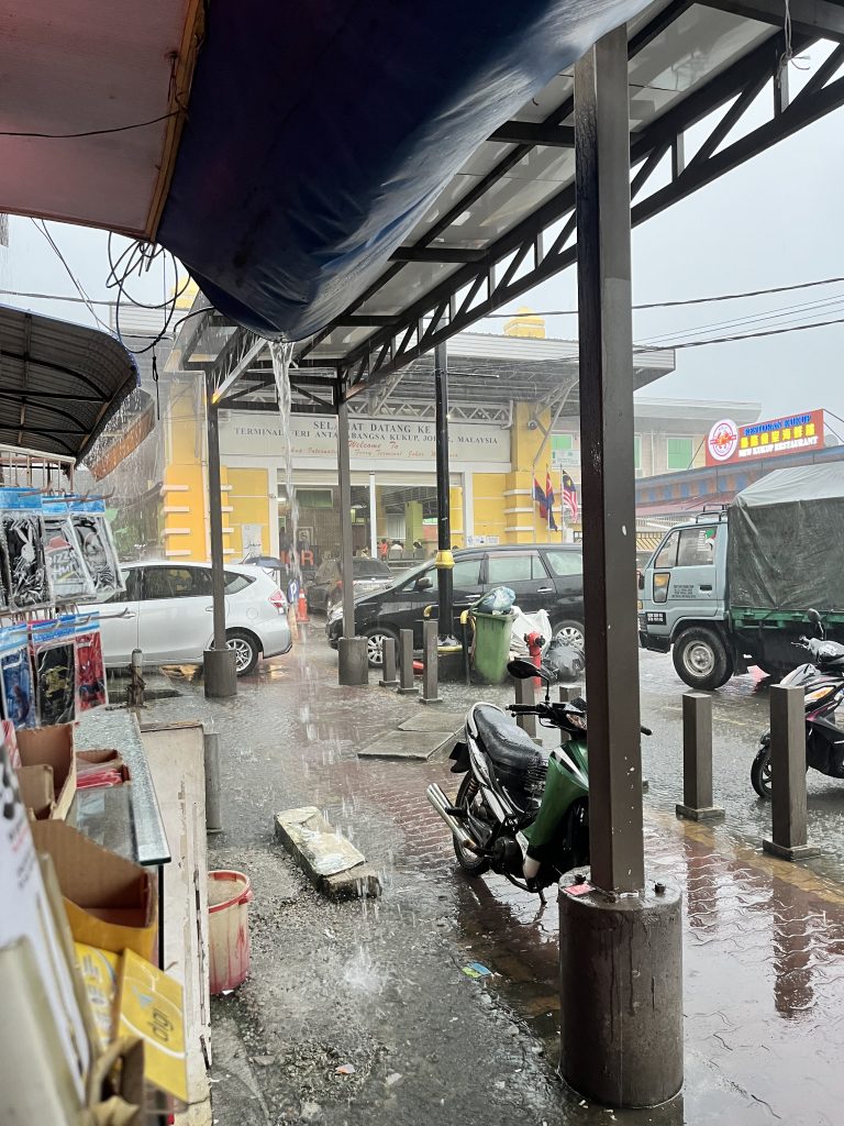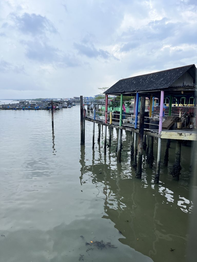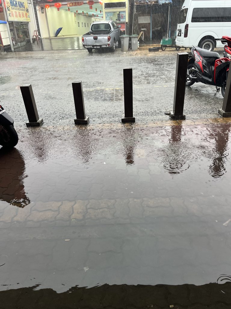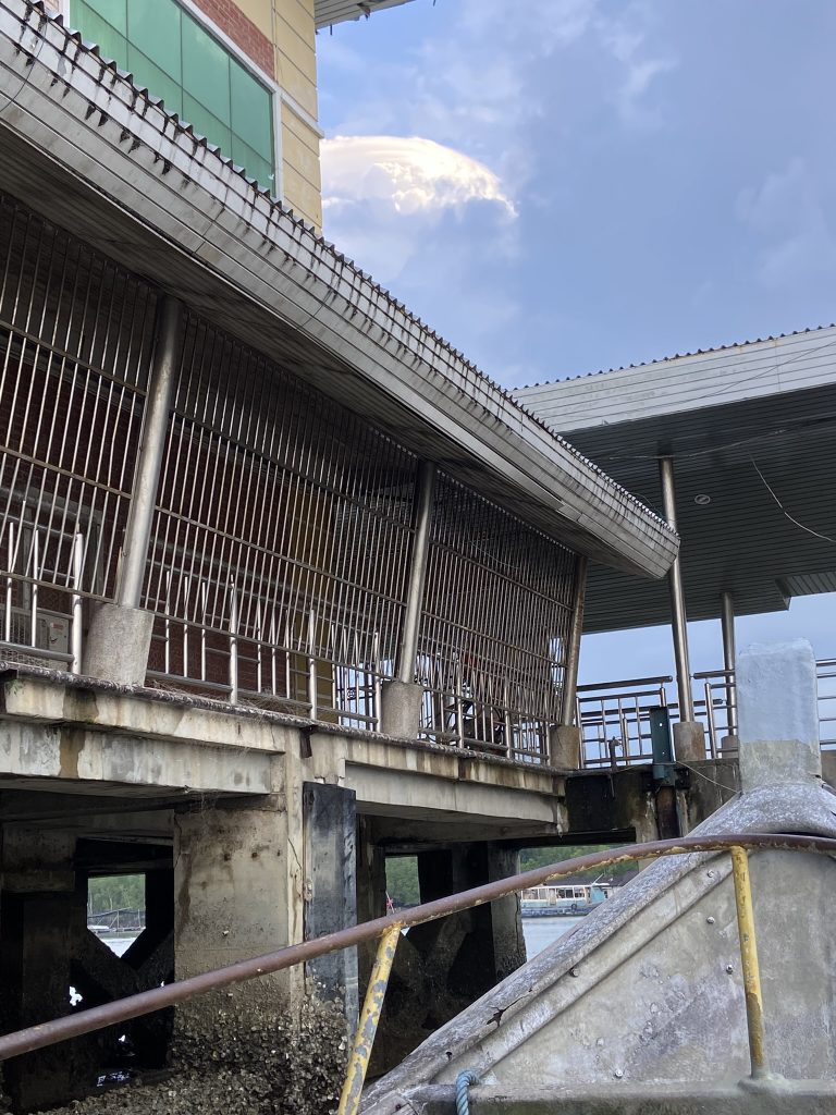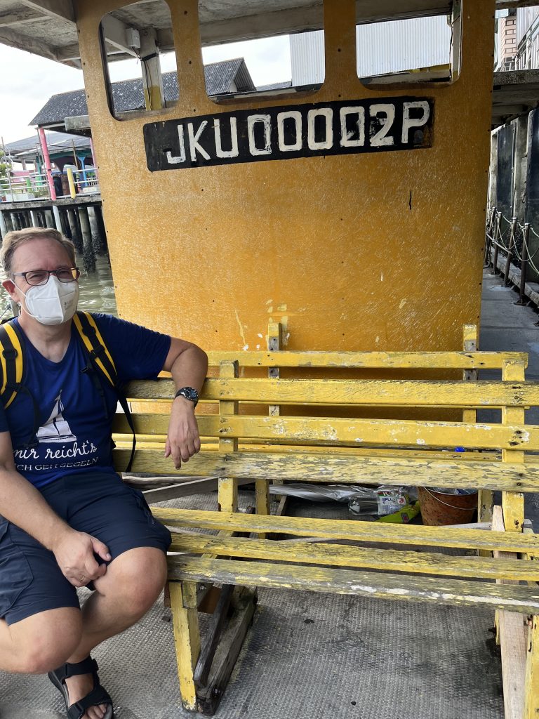 Das geht so eine ganze Weile, bis es endlich wieder aufklart. Und da wir uns heute nur eine kurze Strecke von ca. 20 Seemeilen vorgenommen haben, rückt unser Ziel schon in Sichtweite. PULAU KUKUP, ein kleiner Küstenort mit Fährstation. Bei dieser Fährstation soll es auch die Immigration geben. Für uns wichtig, da wir uns sonst unrechtmäßig in Malaysia bewegen würden. Noch um die letzte rote Boje und dann nur noch gerade aus. Es wird aber immer flacher und flacher. Was ist das denn? 3 Meter, 2 Meter, 1Meter – kreisch – 0,90 Meter, das steht so gar nicht auf der Karte! 50 cm kann man immer noch drauf rechnen, aber bei 1,20 Meter Tiefgang haben wir jetzt auch nur noch 20 cm Wasser unter’m Kiel. Klaus verliert 2 Liter Angstschweiß, von mir sprech ich gar nicht mehr. Klaus versucht noch weiter nach Steuerbord zu kommen, wo eben noch die Fähre lang gebrettert ist. Es klappt, wir gewinnen wieder an Tiefe. Meine Güte, welche Strapaze! So, nun ist der Ankerbereich erreicht, wir haben 6 Meter Tiefe und schmeißen den Anker. Das klappt zur Abwechslung prima und wir machen uns dran, das Dinghy zu Wasser zu lassen. Geschafft! Haben wir auch alle Papiere? Sind alle Luken dicht? Alle Schlüssel dabei? Jep, rein ins Dinghy und ab. Es geht auch richtig ab, denn wir haben eine enorme Strömung, weg vom Boot. NEIN, Klaus schreit, ich hab den roten Stick zum Starten des Motors vergessen… 😲 . Wir haben ein riesen Problem, entfernen uns sehr schnell vom Boot und kommen so nicht mehr zurück. Schnell!!! Paddel raus und in die Hände gespuckt. Aber die Strömung ist zu stark, Klaus schafft es nicht und ist schon fix und fertig. Los, gib mir das eine Paddel und wir versuchen es zu Zweit… Wir sind schon 7, 8 Meter weg und kämpfen uns nur zentimeterweise voran. Noch 5 Meter, schreit Klaus. Wir paddeln wie blöd. Wir schaffen es, noch 5 Meter. Hä, das hatten wir doch eben schon, scheisse wir schaffen es doch nicht… Doch, nur noch 3 Meter, 2, 1, geschafft. Jetzt aber noch die Leine schnappen und gaaanz fest halten! Jaaa! Klaus zieht sich an Deck und ist mehr als halbtot. Hoffentlich gibt’s da jetzt nicht noch nen Herzklabaster!!! Schön ruhig atmen!!! Er berappelt sich, holt den Stick und plumpst ins Dinghy. Zweiter Versuch. Der Motor startet und wir schippern zur Fährstation. So, nun ist das hier aber recht ärmlich, viel Fischerei, eher Hütten als Häuser und keinen Blassen, wo wir mit unserem Dinghy festmachen könnten. Wir fahren um die Fährstation herum und entscheiden uns für Pfähle an einer veralgten, schleimigen Treppe. Oh Mist, da sind viele, super scharfkanntige Muscheln dran, die können unser Dinghy grad so aufschlitzen. Dann besser einen entfernteren Pfahl. Aber wie jetzt auf die schleimige Treppe kommen? Ziemlich wackelig und eingesaut stehen wir endlich an Land. Jetzt schnell zur Fährstation, bevor die noch zu macht. Wir laufen durch ein Lokal, die gucken schon komisch, die Treppe gehört nämlich zu denen. Ahh, die Fährstation! Wir unterbreiten unser Anliegen und man schickt uns um die Ecke, wir sollen dort warten. Es käme dann jemand. Da kommt ein Boot, mit vielen Menschen, einige winken, wir auch und fährt vorbei. Das Boot kommt zurück mit nur noch zwei Mann, legt an, wir sollen einsteigen🫡. Hm, da stimmt doch was nicht. Langsam begreife ich, die wollen eine Besichtigungstour mit uns machen, kostet auch nicht viel. Halt, Missverständnis, wir brauchen eine Immigration. Nix wie raus hier. Wieder zur Fährstation, nochmal alles erklären… Kurz gefasst, wir werden hin und her geschickt, kaufen zwischen drin ne neue SIM Card, werden von Wasserfluten überrascht, es schüttet unglaubliche Wassermengen vom Himmel, wir landen wieder bei der Fährstation und sollen morgen um 10:00 Uhr erneut vorstellig werden. Alles ist jedoch nett und lustig, die beteiligten Personen, und es sind viele, haben ihren Spass beim Suchen nach den richtigen Vokabeln, es wird viel gelacht.