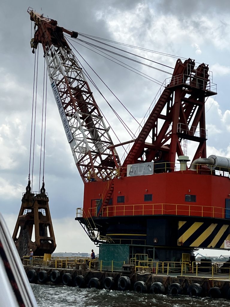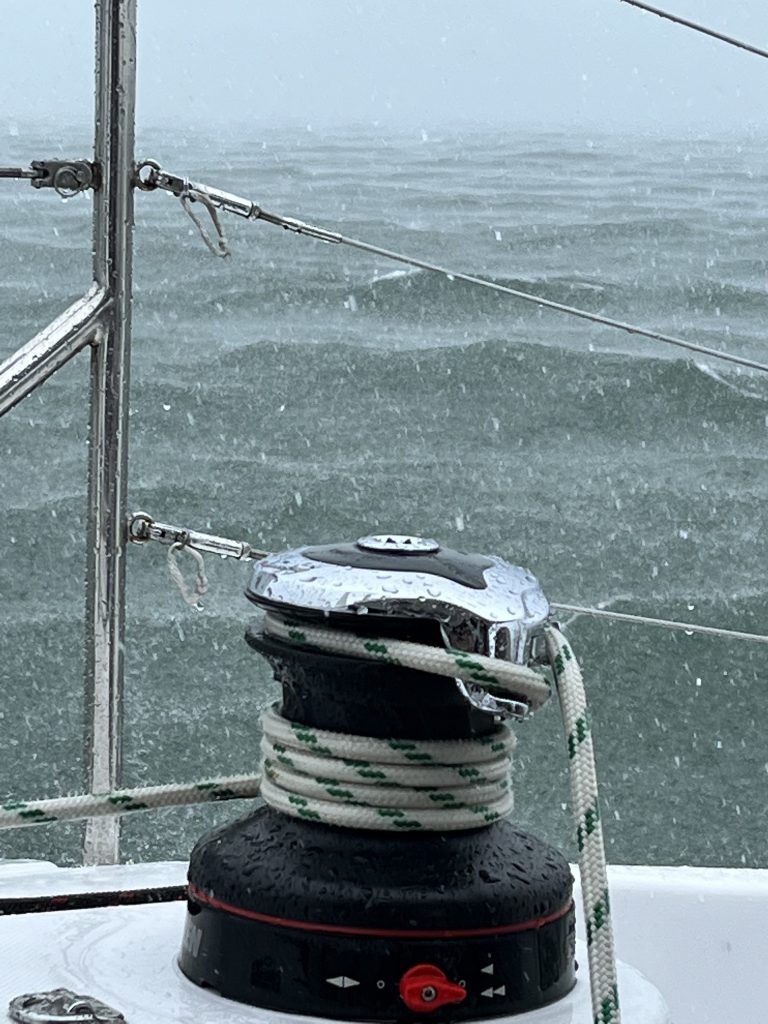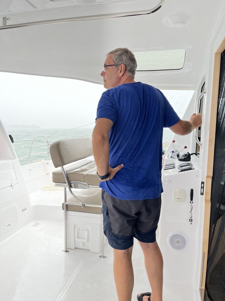 Nun aber flott zum Dinghy. Auweia, es ist Ebbe, es steckt im Schlick und ist voll Wasser. Wir klettern voller Matsch hinein, versuchen händisch etwas Wasser heraus zu bringen und drücken uns mit den Paddeln ins Wasser. Motor starten und ab durch den Regen zum Boot. Hoffentlich hielt der Anker und Yuti ist noch da!!! Jaaa, fest machen und rauf auf’s Boot. Nur noch Wasser vom Beiboot ablassen, ist auch nochmals ein längeres Unterfangen und dann raus aus den klitschigen Sachen. Wie sagte Klaus noch in Altrip, raus aus der Komfortzone, ja, stimmt!!!
