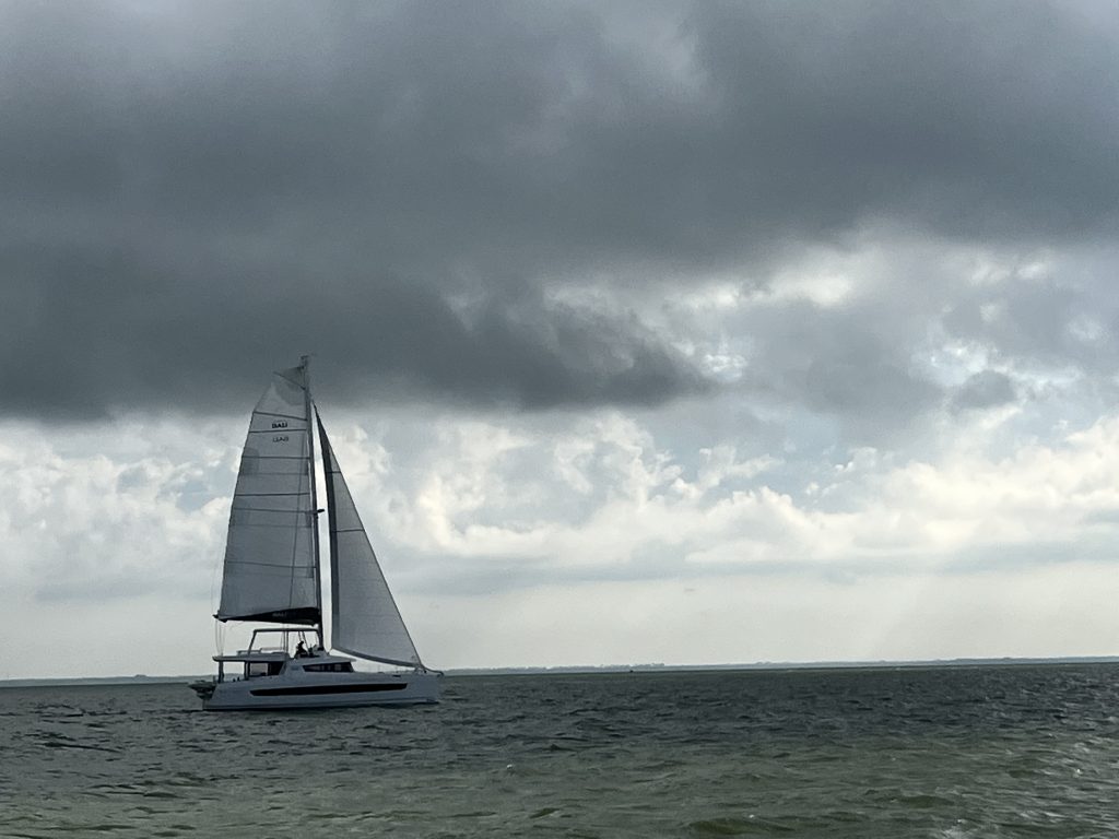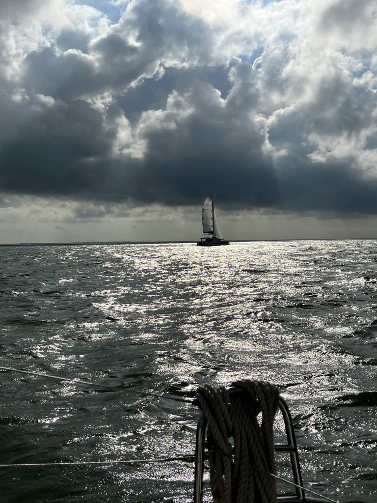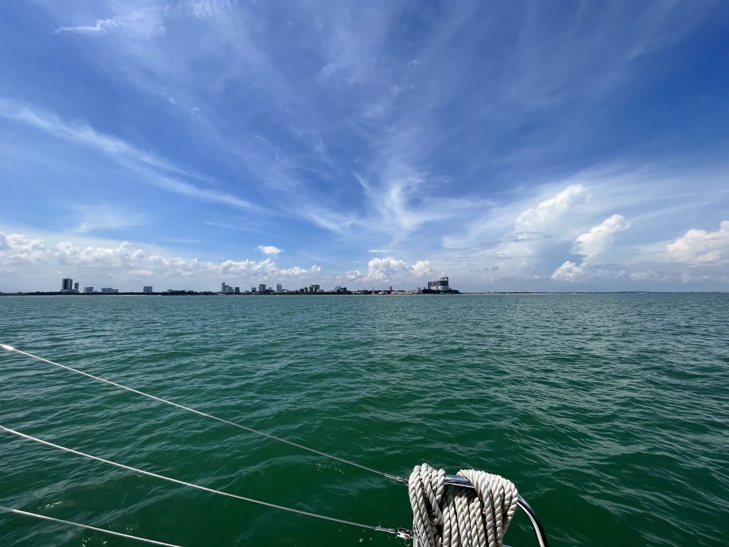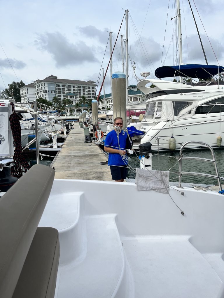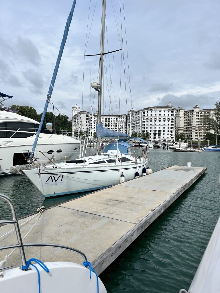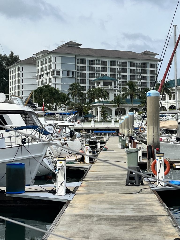 Heute wollen wir nun Port Dickson erreichen und stehen besonders früh auf. Es ist wieder eine Segelzeit von ungefähr 8 Stunden zu bewältigen. Aber es schüttet, gewittert und windet fast bis zu 30 Knoten, noch bei Dunkelheit. Gruselig! Wir schauen mit großen Augen auf unsere Anker App und beten, dass der Anker hält! Er hält, schwitz… Es pfeift und wackelt noch eine ganze Weile, bis Klaus entscheidet loszufahren. Das bedeutet, ich muss vor zum Ankerlichten. In Musto Regenjacke (als Superschnapper letzten Herbst in Kroatien gekauft) wackel ich nach vorne und gebe das Kommando zum Hochziehen. Aber nur bis zur Bridle. Diese Ankerkettensicherung muss erstmal auf Knien gelöst werden, bis die Kette vollständig hochgezogen werden kann. Aber ich muss sagen, es klappt mittlerweile schon echt gut, das Zusammenspiel zwischen Klaus und mir. Bei diesem Wetter lassen wir das Groß verpackt und rollen nur das Jib (Vorsegel) aus. Auch heute wieder, Wind sehr wechselhaft und ungünstig und Strömung volle Pulle against us. Dazu noch ewig lange Regen und diesige Sicht. Viel Dreck kommt uns heute entgegen. Pflanzeninseln gespickt mit Plastikmüll, Kokosnüssen und fetten Holzbalken. Wir müssen gut aufpassen, dass nichts in unsere Schrauben kommt! Weiter geht‘s, vorbei an vielen Öltankern, auch an einem Tanker namens Sotschi. Dreimal darfst du raten, wo der wohl herkommt… Dann, das Wetter wird besser, die See beruhigt sich, der Regen hört endlich auf und wir erreichen die Marina Port Dickson.