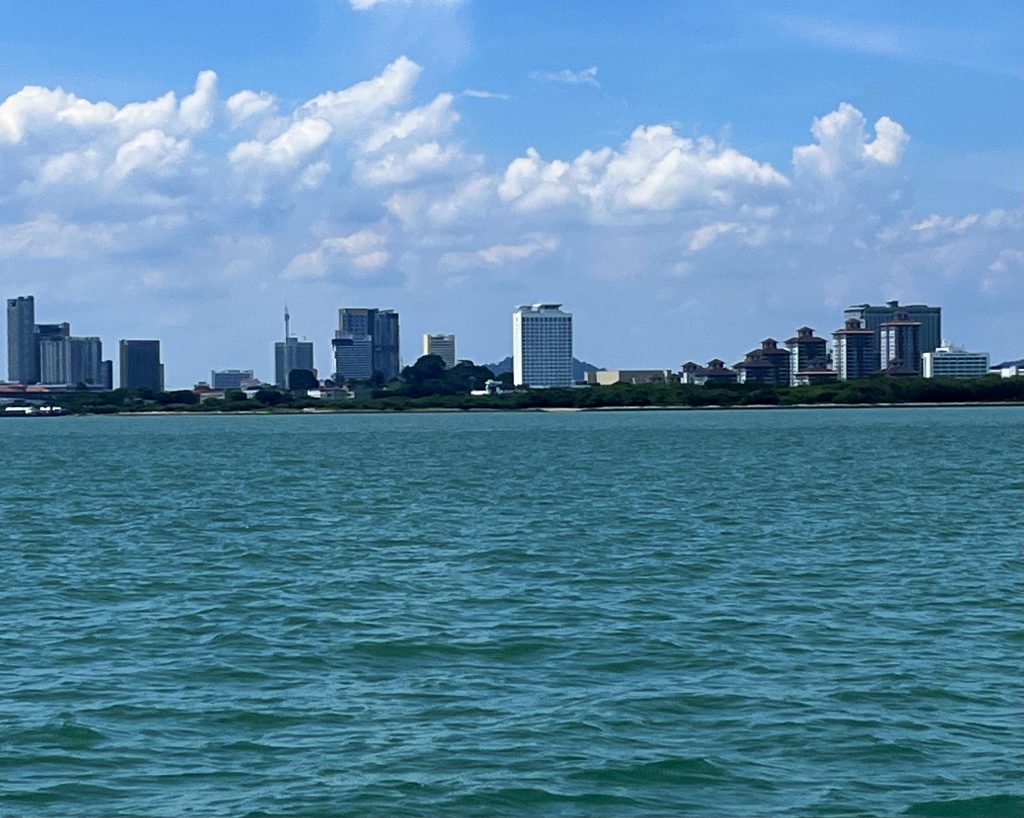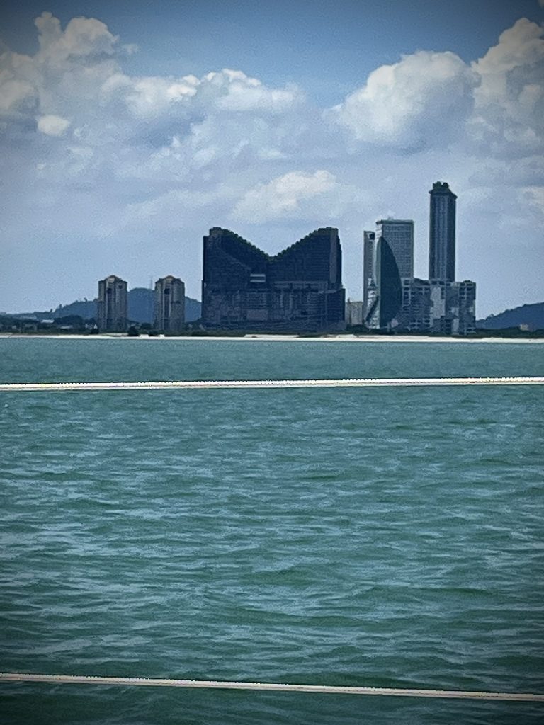Am nächsten Morgen ging es weiter Richtung Malakka. 7 bis 8 Stunden Motor-Segeln mussten absolviert werden. Warum immer mit Motor? Wir haben entweder wenig Wind oder Wind von vorn. Zusätzlich haben wir überwiegend Strömung von bis zu 2,4 Knoten gegen uns, blöd. Also ohne Motor ist da nichts zu machen. Gut, dass wir zwei haben… 😅. Für die Malakka Marina bräuchten wir wieder den ganzen Immigration Wahnsinn und da wir in unseren Kukup Papieren, Port Dickson als nächsten Zielhafen stehen haben, fuhren wir weiter bis zu der kleinen Insel Upeh. Laut unserem aktuellen Southeast Asia Pilot, eine schnuckelige Insel, mit Restaurant, Pool und Wassersport. Über Seglerbesuch freue man sich. Wir uns auch! 😃 Zuvor ein paar Fotoeindrücke von Malakka vom Wasser aus.