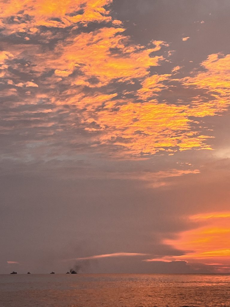 Und los geht’s. Das erste Mal überhaupt stürzen wir uns in die 30 Grad warmen Fluten. Zuerst schwimmen wir unter unser Boot und inspizieren den “Unterboden”. Sieht alles prima aus und das Wasser schimmert hier hellgrün. Jetzt geht’s rüber zum Strand. Ich schwimme zu den Felsen, die Motorboote immer fest im Blick. Puh, angekommen. Klaus schwimmt den längeren Weg direkt zum Strand, mutig! Zum Glück haben ich Badeschuhe an, denn die Felsen sind übersäht mit Muscheln, scharfkantigen Muscheln. Wie ne Oma krabbel ich da herum. Halt, ich bin ja auch eine Oma, nein, eine Omi. 😜 Zwischen den Felsen sind immer mal wieder kleine Priele und ich entdecke Seegurken und kleine Fischchen. Irgendwann komme ich auch am Strand an. Klaus ist längst da und wird sofort gefragt, wo wir denn her kommen? Aus Germany, ah, nein, wo wir jetzt herkämen? Von dem Boot da vorne. Was, von dem Boot, na ihr könnt wohl schwimmen… Ja, sollten wir! 😝 Aber stimmt schon, hier ist immer irgendwie Strömung und damit ist es nicht so ganz einfach an’s Ziel zu kommen. Herrlich der Strand, die Palmen, das Urwald Zierpsen der Grillen und die wirklich schönen Felsen. Gut! Und nun wieder zurück. Aua, was pikst mich da am Bein, am Arm und an der Brust??? Es zwickt und zwackt und brennt… Klaus hatte das schon beim Hinschwimmen. Blöd, nicht dramatisch aber unangenehm. Wie bei Brennnesseln… Wieder an Bord, abduschen und gleich mal googeln. Ahhh, nesselndes Plankton und/oder Mini Quallen. Beides mit bloßem Auge nicht zu erkennen, aber häufig in tropischen Gewässern. Na super … 🤪 Ich hab mich schon gefragt, warum die Einheimischen immer mit voller Montur in’s Wasser gehen. Die Frauen mit Kleid und Kopftuch, die Männer mit Shirts und Hosen… Also nicht n u r aus religiösen Gründen, sondern auch als Schutz gegen die Nesseln. Wieder was gelernt!