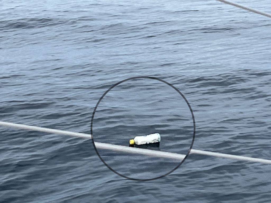 Kurze Zeit später kommen mehrere Dreckinseln auf uns zu. Erst kommt eine Flasche, dann der üble Rest.