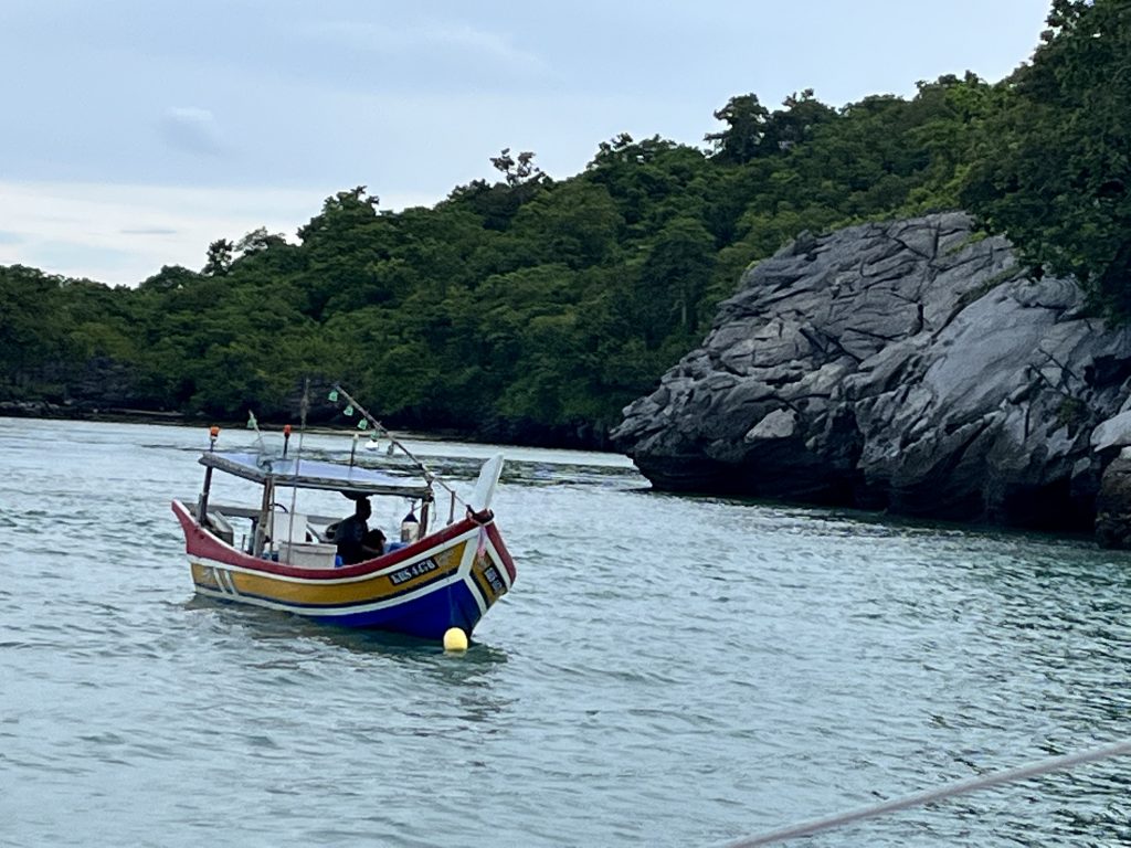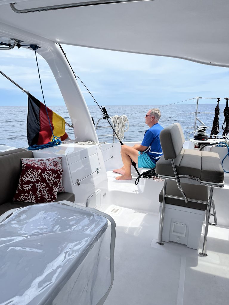 Genau, zum Propeller tauchen und nachschauen, ob sich die Angelschnur dort verfangen hat. Die Leine um seinen Bauch, soll das Abdriften verhindern. Ja, die Strömung ist stark, verdammich noch mal! Ich kann ihn kaum halten.😅 Also, am Propeller ist nichts. Jedenfalls sieht er nichts… Dann wieder rauf auf’s Boot, abbrausen, anziehen und los geht die Fahrt. Auch heute liegen wieder ca. 65 Seemeilen vor uns, bis wir eine vorgelagerte Insel von Langkawi erreichen werden, um dort ein letztes Mal zu ankern. Langkawi besteht aus 101 Inseln, mit einer Hauptinsel, wo auch der Royal Marina Yacht Club Langkawi angesiedelt ist. Unser vorerst letztes Ziel in Malaysia, bevor es 2, 3 Wochen später weiter nach Thailand gehen soll. Etwa zwei Stunden nach unserem Aufbruch wird’s ungemütlich. Gewitter und kräftiger Regen ziehen auf, gefolgt von unruhiger See. Schnell ziehen wir noch die Regenschutzverkleidung vom Steuerstand auf, aber nass wird es trotzdem.
