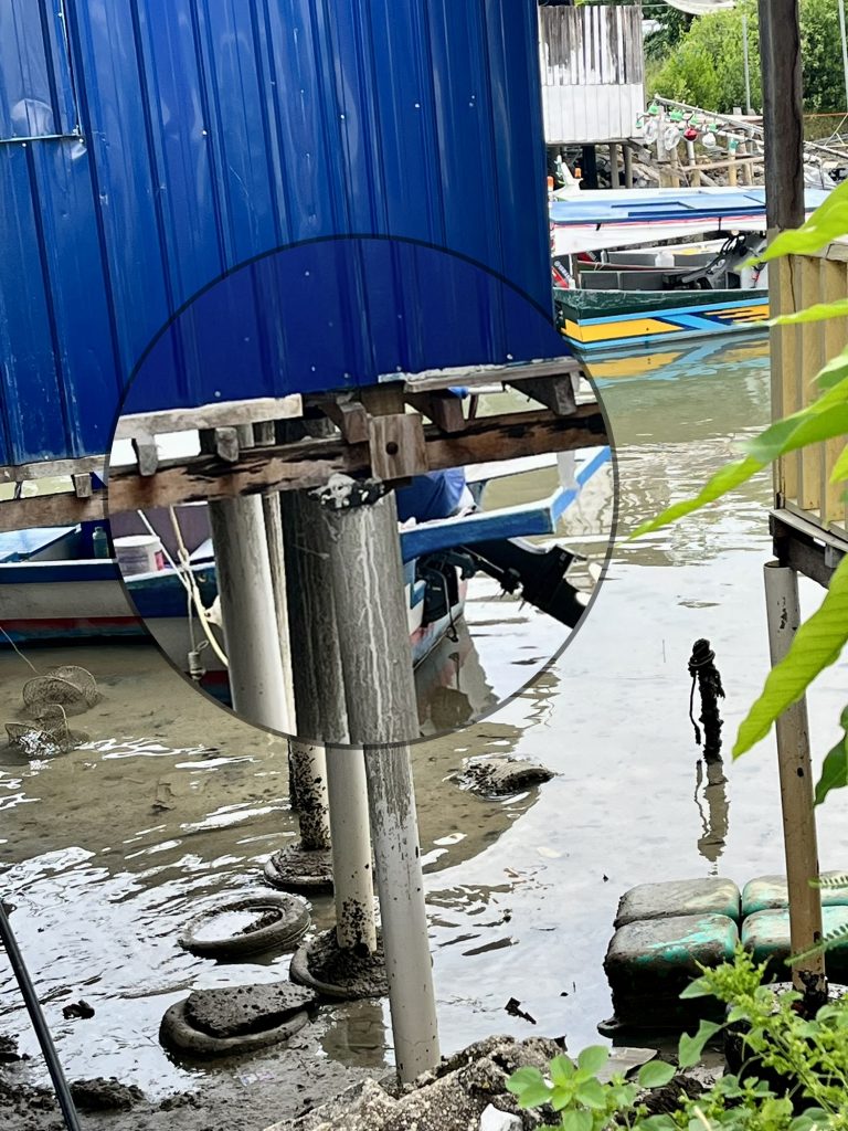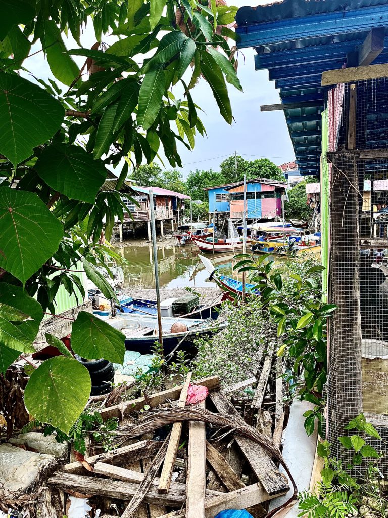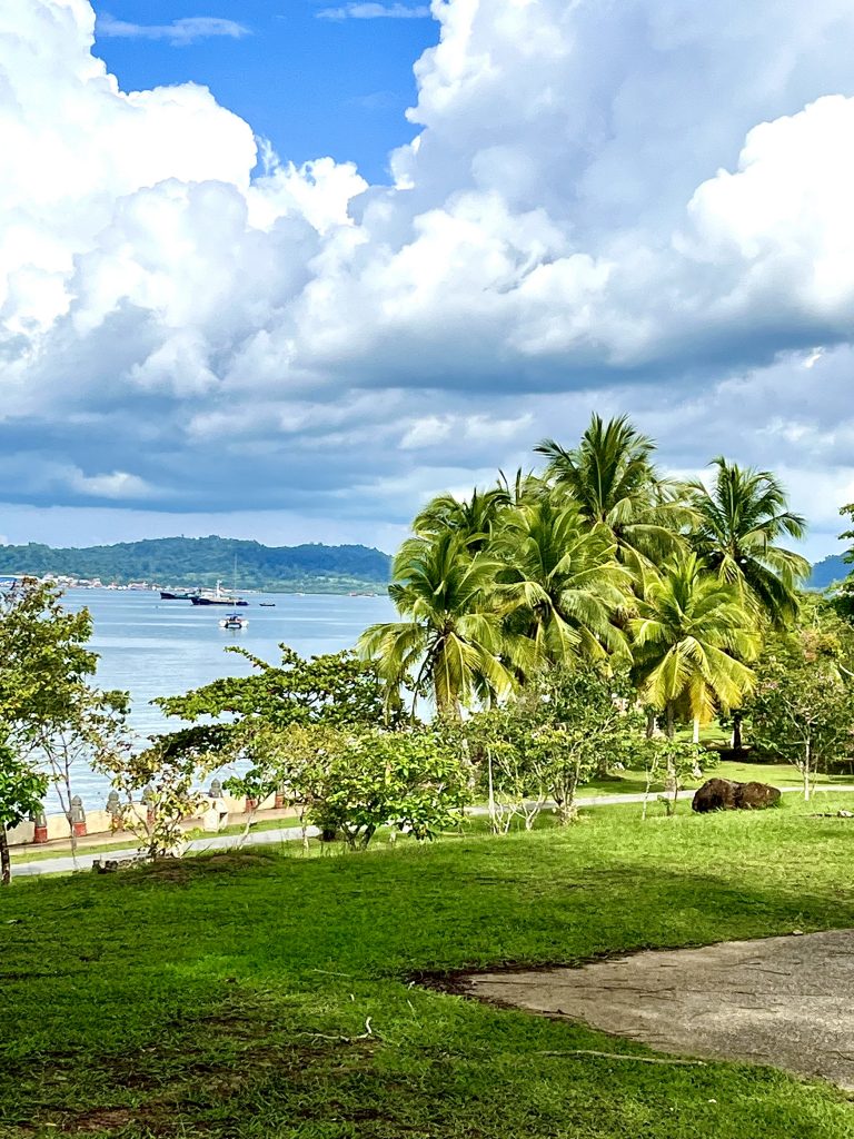 Die Waschräume wären noch erwähnenswert. Von unserem Steg seeehr weit entfernt, müssen wir uns schon sehr rechtzeitig überlegen dort hinzuwandern. Wenn es eilig sein sollte , dann gäb’s sicher ein Unglück. Also, erstmal lange Stege entlang, durch das Absperrtor, Treppchen rauf und Treppchen runter und dann einen Holzsteg durch grünen Dschungel hindurch, mit entsprechender Urwaldakustik (lautes Grillenkonzert) und dann hat man es fast geschafft. Da steht es das Bade- und Toilettenhäuschen in Betonoptik, innen… Wenn es jedoch regnet und es regnet hier täglich, brauche ich eigentlich nicht extra in die Duschkabine gehen. Das Dach ist kaputt und offen. Aber nur auf der Damenseite. Geckos überraschen mich gerne auf der Toilette, sind aber niedlich und klein und sehr flink. Toipapier gibt’s nur nass und wellig, das Dach ist ja offen… 🤪 Aber sonst…