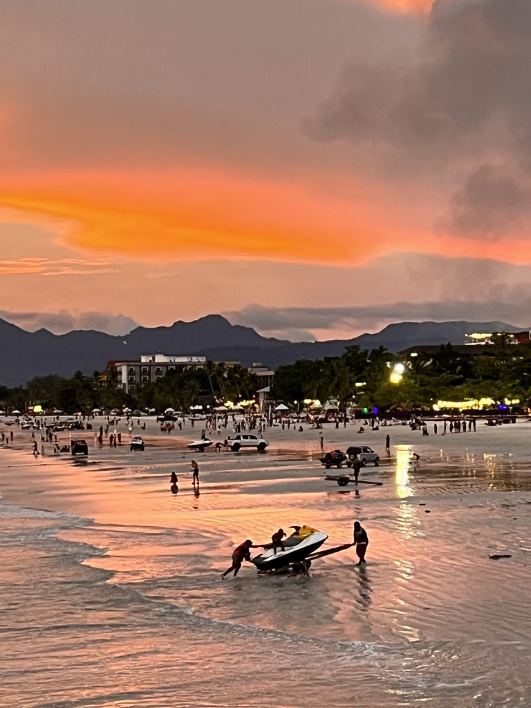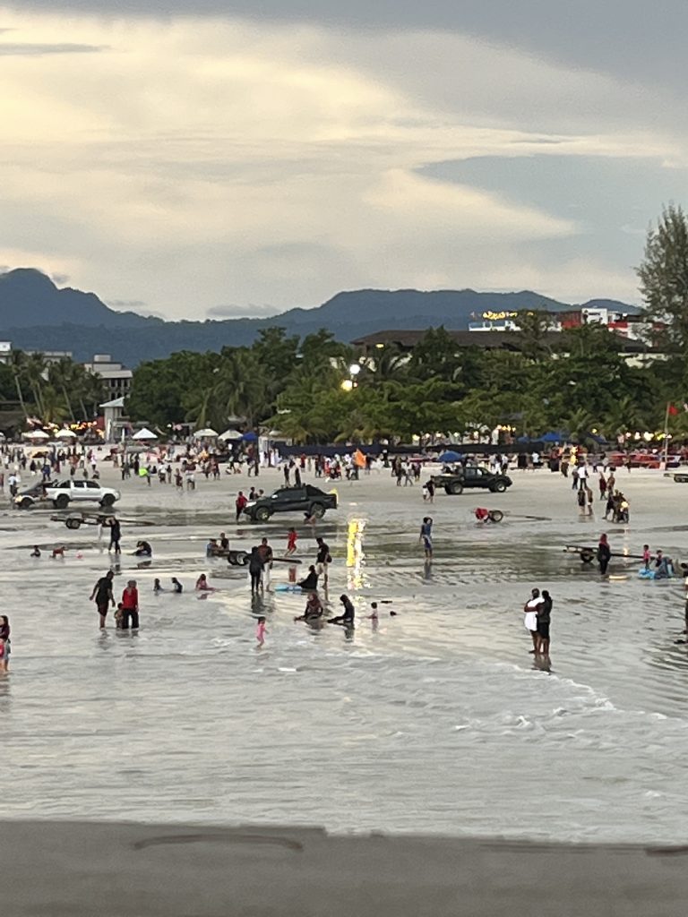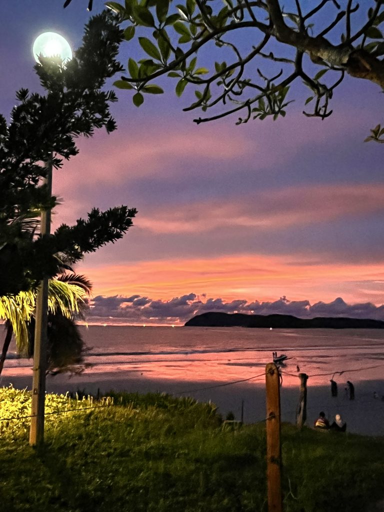 Vom Restaurant aus beobachten wir, wie sich der Strand zum Abend hin immer mehr füllt. Was ist das? Wir erspähen Feuerspucker, Jongleure mit Feuerfackeln und immer mehr Menschen.
