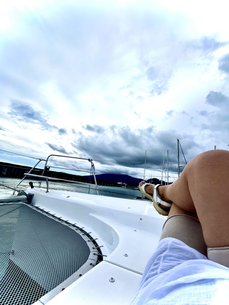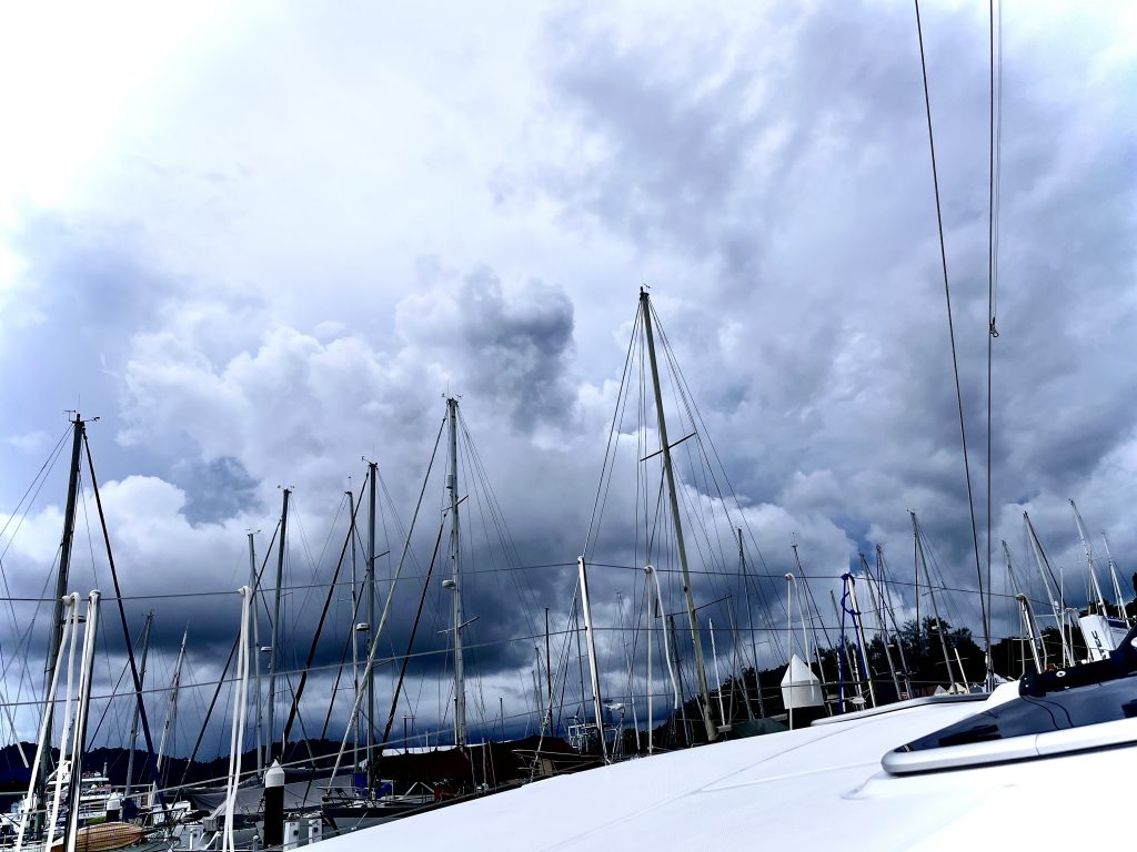 Heute steht Bootsputz an. Erstmal das Boot saugen, parallel die erste Ladung Wäsche waschen, erschrocken feststellen, ups, wir haben ja kaum noch Wasser im Tank. Also schnell den Schlauch rausholen, anschließen und Wasser marsch. Weiter saugen, parallel Obst schnibbeln, ach, da fängt es an zu regnen! Da muss der Schlauch schnell wieder raus aus dem Tank, Tankdeckel zu, damit kein Schmutz in den Wassertank gerät. Weiter saugen, Waschmaschinchen ist fertig, Wäsche zum Trocknen unter’s Vordach hängen, zweite Ladung Wäsche “aufsetzen” und fertig saugen, nachdem der Sauger flux nen neuen Akku bekommen hat. Auweia, ich ziehe den Akkusauger hinter mit her, ohne zu gucken, da poltert er das Treppchen runter und scheuert gegen eine Schranktür. Bums! Ein fetter schwarzer Streifen samt Kratzer ist das Ergebnis. Das gibt Ärger 😯. Aber zum Glück gibt es ja Zauberschwämmchen! Nach ner Viertelstunde intensiver Bearbeitung ist der Bremsstreifen weg und der Kratzer nicht mehr zu sehen. Dafür bin ich zum zweiten Mal geduscht ohne Abtrocknen… 🥵. Eben hat’s aufgehört zu regnen, also Schlauch wieder rein in den Tank und Wasser marsch zum Zweiten. Die zweite Ladung Wäsche ist fertig und muss aufgehängt werden. Nun wird gekocht. Das heißt, Klaus kocht schon aber anders… Während ich so rum wusele und schwitze, vertieft er sich in die Technik unseres Fernsehers. Er hat Probleme, Apps, etc. , vom Handy auf’s TV zu spiegeln und stellt nach Stunden der Recherche fest, unser TV ist von 2018, also 4 Jahre alt. 🤬 So kann das alles nicht funktionieren und Klaus kocht! Na, ich koch’ dann mal Reis mit Gemüse…