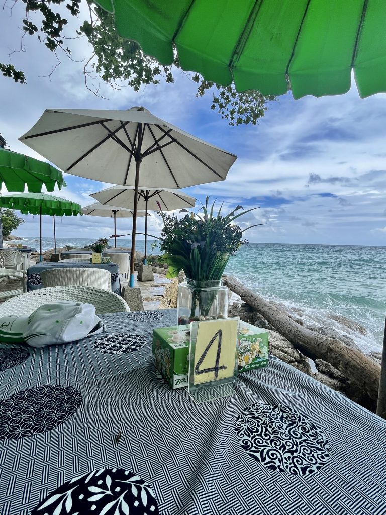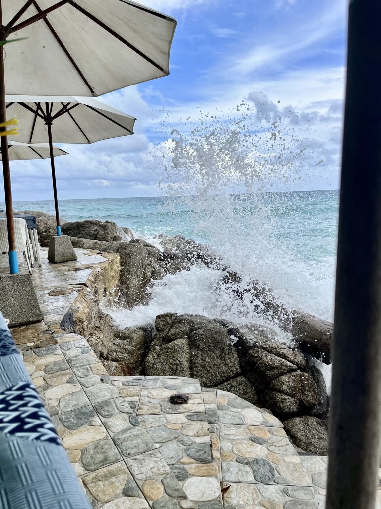 Nächster Tag, heute sind wieder Strände angesagt! Wir düsen ein ordentliches Stück nach Süden und erreichen als Erstes Surin Beach. Dieser Strand war früher einmal voller Buden und Leben, heute ist es hier ruhig, etwas müllig und in der Nebensaison ordentlich brandig. Der Wind kommt ja nach wie vor von Westen und peitscht die Wellen an Land. Ein hübsches Lokal sticht uns aber in’s Auge und wir nehmen Platz.