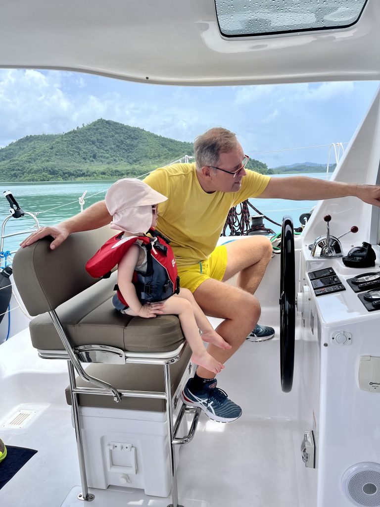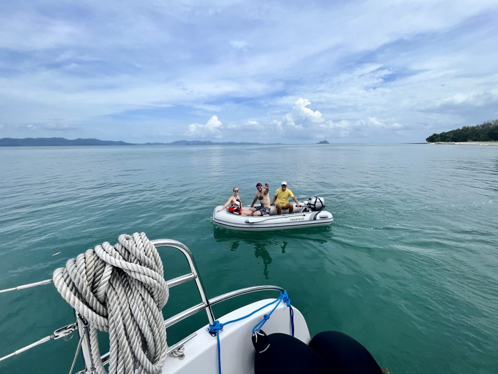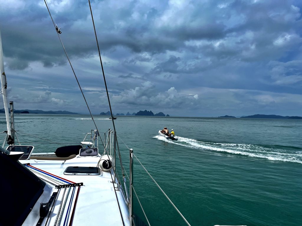 Nächster Tag, das Wetter hält. Heute machen wir einen Ganztages- Bootsausflug mit Yuti. Aufregend!! Um 9:00 Uhr ist die Crew vollständig. Kapitän Klaus macht die Einweisung und erklärt die geplante Route, sowie das Ziel der Exkursion, Lawa Yai Island. Ein Inselchen, ca. 11 Seemeilen von unserer Marina entfernt. Leinen los, wir legen ab.