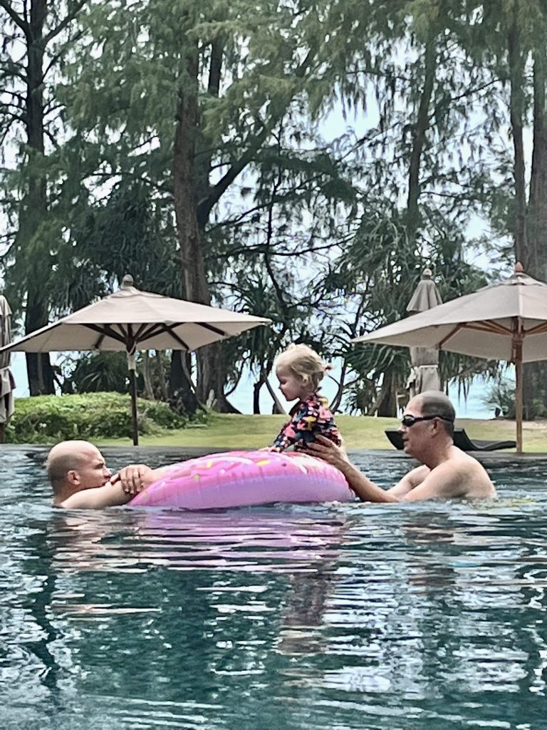 Heute genießen wir noch einmal die wunderschöne Hotelanlage von A bis Z. Opi und Alva toben im Pool, Norman kommt dazu, wir snacken an der Bar, Opi stürzt sich in‘s Meer, trotz roter Fahne. Das gibt Ärger, ein Hotelmitarbeiter ruft, er solle rauskommen, Larissa ruft zurück, dass ihr Papa nichts hört und sieht… 😆. Naja, Klaus kommt dann aber trotzdem irgendwann raus. Larissa und Norman genehmigen sich noch eine letzte Thaimassage, dabei fällt ihnen auf, dass es morgen nach Hause geht… 😎 Sie hatten irgendwie gedacht, erst übermorgen fliegen zu müssen, Upsi. 😳 Währenddessen macht Alva bei mir am Pool ihren dritten Stinker des Tages. 💩Ohne Windel, direkt in den Badeanzug, der hängt ihr dann bis zu den Kniekehlen. Dieses groooße Geschäft sauber rauszubekommen ist gar nicht so leicht. Zum Glück bekommt es sonst keiner mit, außer Klaus, der aber prima hilft. Dann gibt es ein letztes Abendessen an der Bar, der sogenannten Sandbox, wo wir nach plötzlich einsetzendem Starkwind noch schnell gesandstrahlt werden und flott das Zimmer aufsuchen.