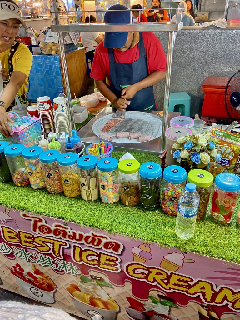 Der Nachtmarkt nahe Phuket Town ist der größte und netteste hier auf der Insel und findet nur sonntags statt. Wir waren schon zuvor alleine dort und freuen uns nun auf einen weiteren Besuch zu Fünft! Neben einem großen kulinarischen Angebot, gibt es Kleidung aller Art, Spielzeug und viel Nippes. Wir mampfen uns erstmal gründlich durch. 😋 Es gibt gebackenes Hühnchen mit Käsepommes (Hühnchen wird hier überhaupt immer gegessen. Morgens, mittags, nachmittags und abends), Kokosnuss Puddingbällchen, Crêpe mit Nutella und Bananen, Spareribs, Zitronen-Honig-Minze-Eis, Pizza Bolognese ohne Nudeln, Pizza Schinken Ananas und gehacktes, geplätteltes und gerolltes Vanille-Erdbeer-Nutella-Eis mit Caramelsauce, sowie Passionsfrüchte auf speziellen Wunsch von Alva. Dazu Wasser, Cola, Fruchtsmoothies und Espresso. Wenn das nichts ist!!!