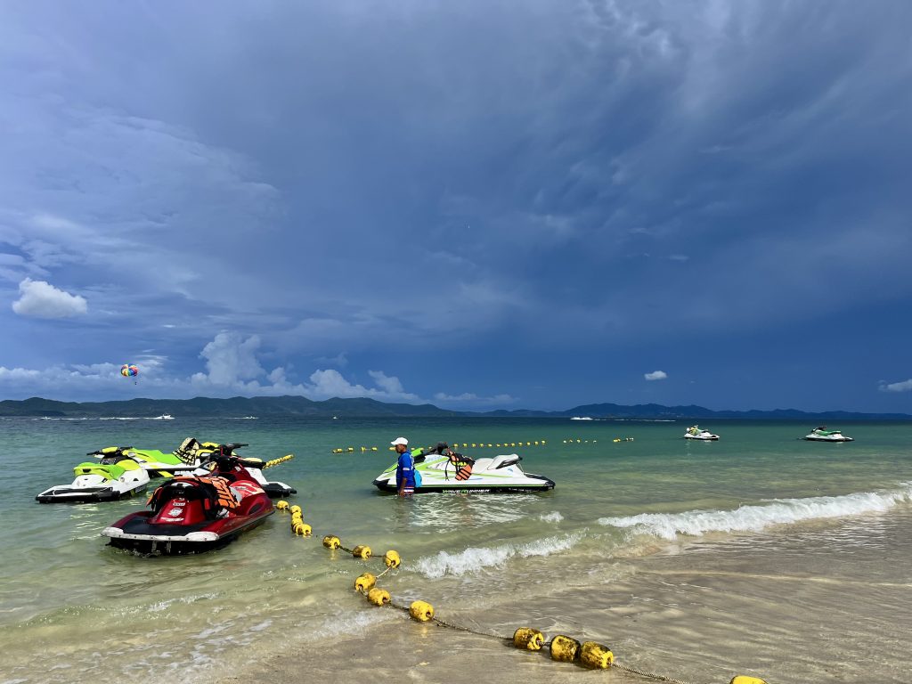 Etwa 23 Personen und wir, brettern mit 2 X 250 PS über‘s Meer, zu einer Ansammlung wunderschönster Inseln, mit unterschiedlichsten Attraktionen. An Bord, gekühlte Getränke, der sehr unterhaltsame Mac, der Speedboot Fahrer und ein weiterer Mitarbeiter zur Unterstützung. Alle Profis durch und durch.