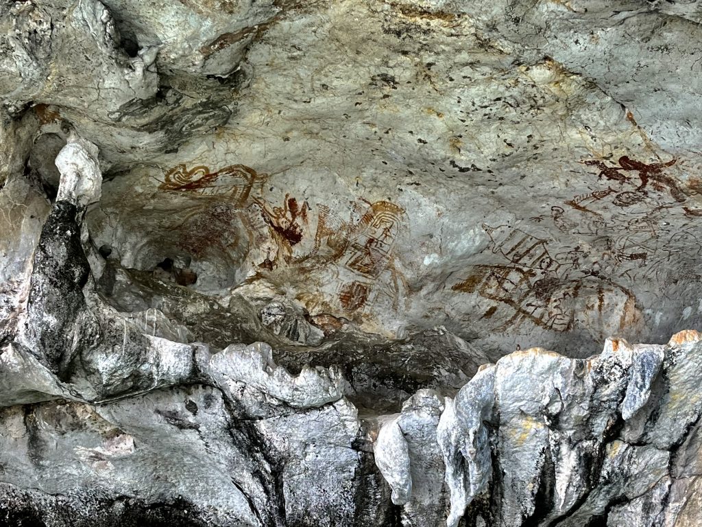 Jetzt aber weiter, wir haben Hunger! Ziel ist das vor 300 Jahren, von 6 Indonesiern, ein auf Pfählen errichtetes moslemisches Dorf, wo das Mittagessen schon auf uns wartet. Doch vorher wird noch ein kleiner Schlenker gefahren, um uns 3000 Jahre alte Felsmalereien zu zeigen.