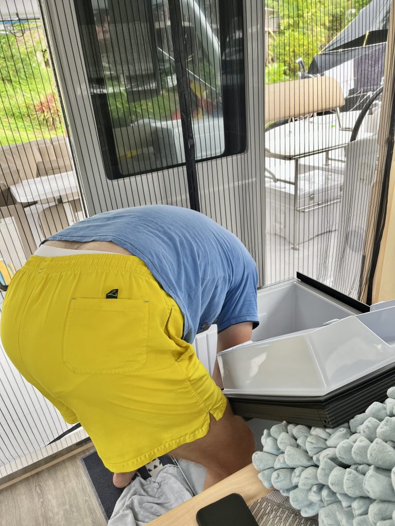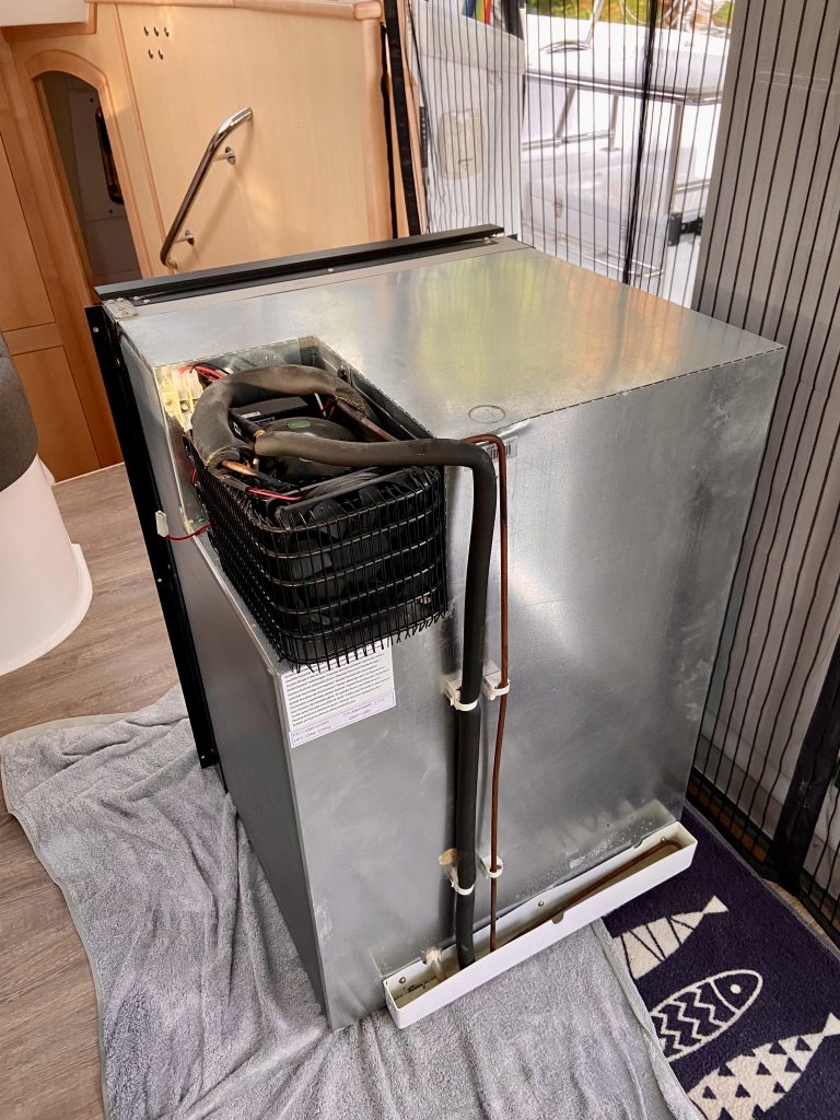 Was soll ich sagen? Am Ende ist der Thermostat samt Fühler getauscht. 👏 Nun muss das Gerät wieder zurück in die Küche und wieder angeschlossen werden. Das war jetzt auch wieder nicht so einfach wie es klingt, aber geschafft haben wir es dennoch. 😅 Nun heißt es eine Stunde warten, bis sich das Kühlmittel wieder beruhigt hat, dann anschalten und hoffen, dass der neue Thermostat funktioniert. Derweil mache ich mich an den inneren Bootsputz. Mein Gott, selbst die Ventilatoren sind völlig verdreckt. Toiletten putzen, Küche wienern, Staub wischen, Saugen und Wischen. Morgen noch Betten abziehen und Koffer packen… 🧳