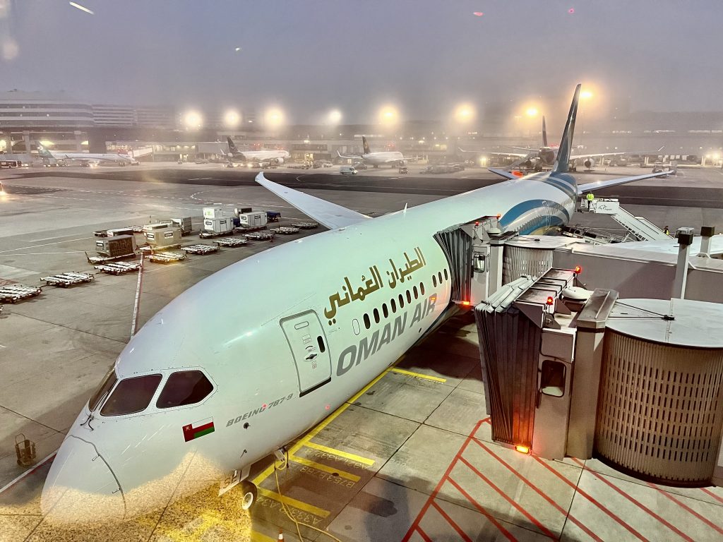 Eine Stunde Flug, dann 4 Stunden warten, dann geht’s weiter nach Muscat im Oman. Wir fliegen mit Oman Air und können uns nicht beklagen.