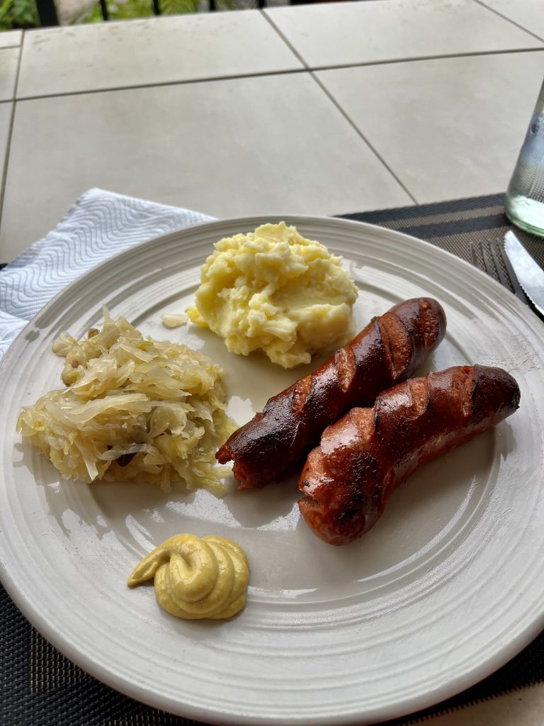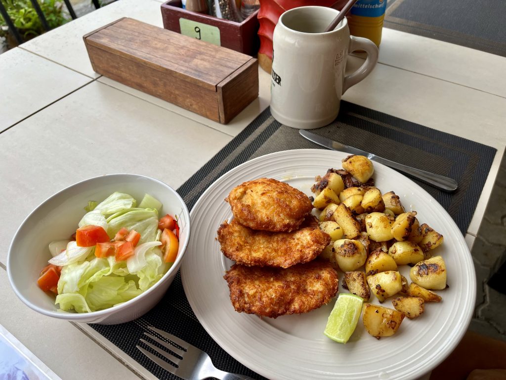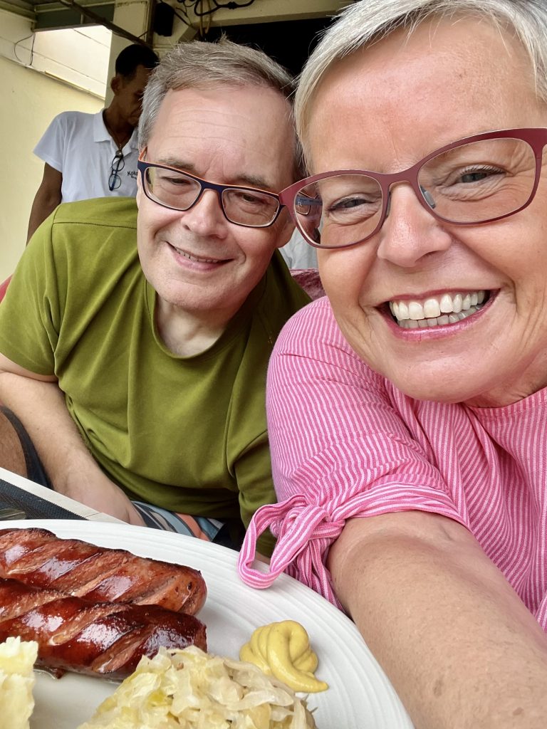 Während wir uns dem Fotoshooting widmen, schrubben zwei Mitarbeiterinnen von Toi unser Boot. Dekadent? Nun ja, wir hatten den Eindruck gewonnen, Toi würde sich freuen ihre Ladies beschäftigen zu können, da haben wir ihrem Vorschlag halt zugestimmt. 😅 Während dieser Plackerei würden wir an Bord natürlich nur stören, also ab dafür. Neben dem lustigen Haus haben wir gleich noch den deutschen Bäcker mit seinem Restaurant besucht. Ein wohl angesagter Deutschen Treff. Nun ja, von Bäckerei war dann aber nichts zu sehen, Deutschen Treff okay und das Restaurant bot Deutsch/Österreichische Küche. Die haben wir natürlich auch sofort probiert!