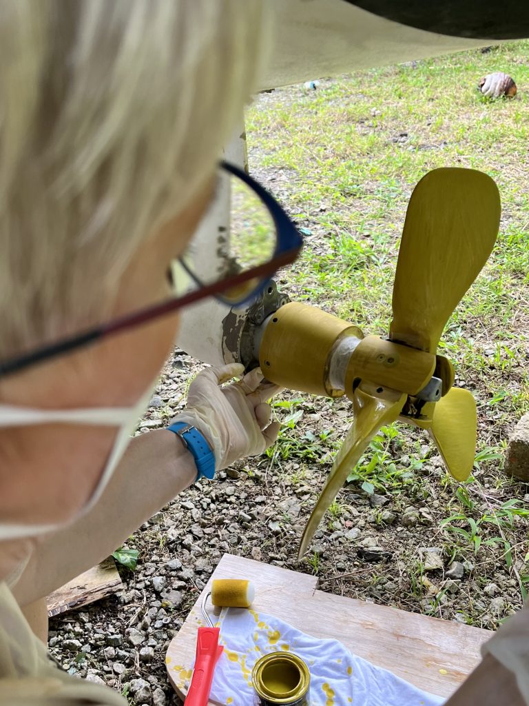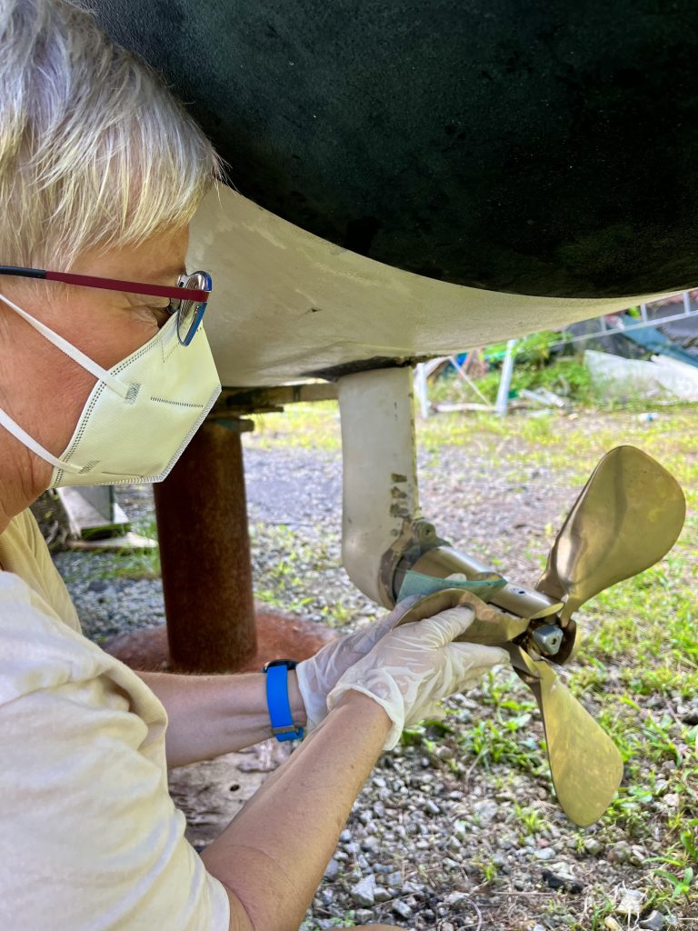 Ich halte mich penibel daran und finde das Ergebnis …….. dööf. Es ist kein dicker, schöner, glatter Schutzlack entstanden. Stattdessen sieht man alle Pinselstriche und nur der letzte aufzutragende, durchsichtige Lack scheint mir okay. 🤔 Was war jetzt das? War der Pinsel zu grob, mit Rolle ging es aber gar nicht…Nun, hoffen wir mal, dass trotz unschönem Erscheinungsbild sich die Seepocken dennoch erschrecken und nicht an den Propeller gehen!