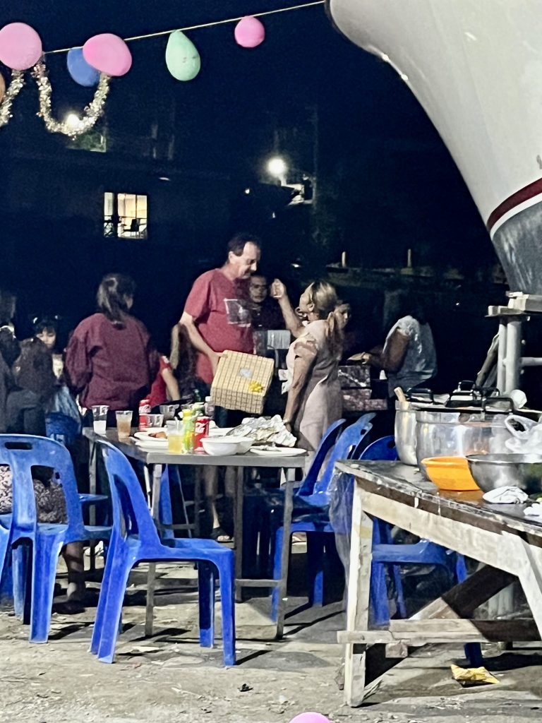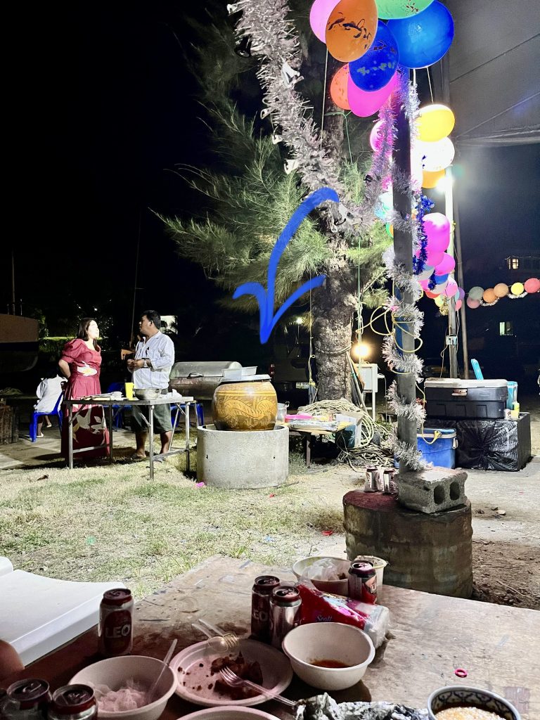 Um 07:00 pm ist’s dunkel und so erreichen wir in völliger Finsternis unseren Platz samt Boot. Aber da ist es ja gar nicht ganz finster, da wird gefeiert. Luftballons hängen, Lichterketten leuchten und mindestens 30 Leute sind gut drauf und feiern. Toi scheint so eine Art Betriebsfest zu inszenieren, mit vielen Speisen, Musik, Gelächter und Geschenken. Wir haben just unseren Wagen unter’m Boot geparkt, da werden wir auch schon von Claude, dem Partner von Toi, dazu gebeten. Nett!!! Claude ist ja Luxemburger und so können wir uns bestens in deutsch mit ihm und seinem Cousin unterhalten. Und jetzt kommt’s. Wir bekommen ein Angebot, welches wir nicht ablehnen können. Eine große Portion SCHWEINEBAUCH. 😝 Ach du meine Güte, Wabbelbauch, was mach ich bloß??? Todesmutig steche ich mit der Plastikgabel zu, schiebe es rein in meinen Mund….. und oh Wunder, es schmeckt fantastisch 🤩. Das Fett ist ganz cross geschmurgelt und die Würze des Fleisches ist köstlich. Die Zubereitung findet in einem großen Tongefäß statt und ist was ganz besonderes. Na dann lasst mal die zweit Portion rüberwachsen… 😋.