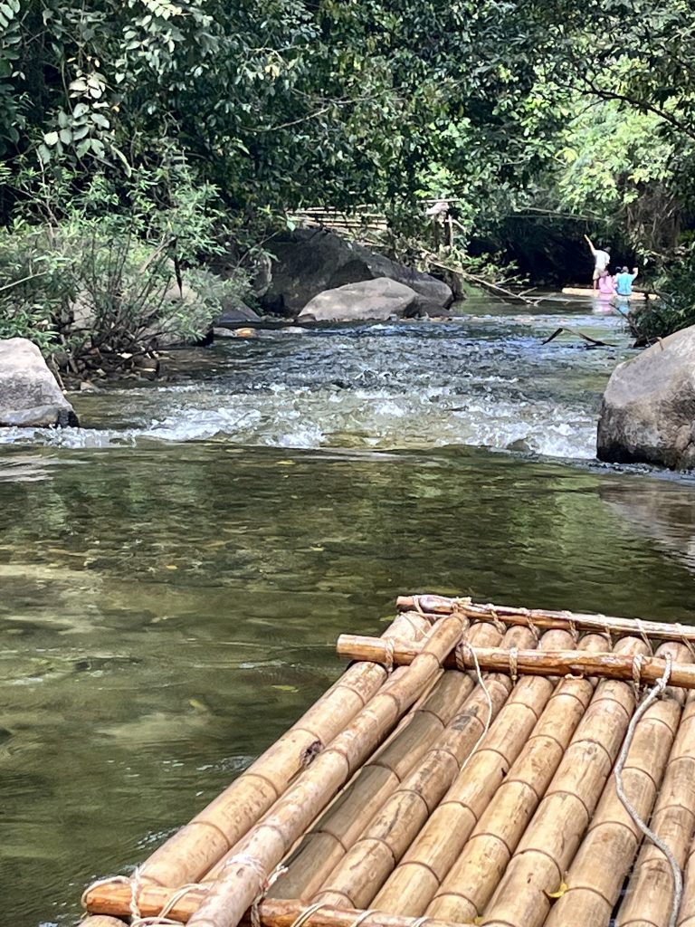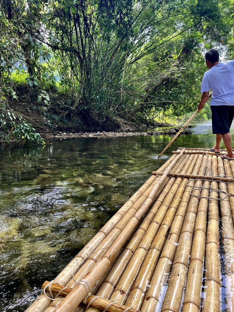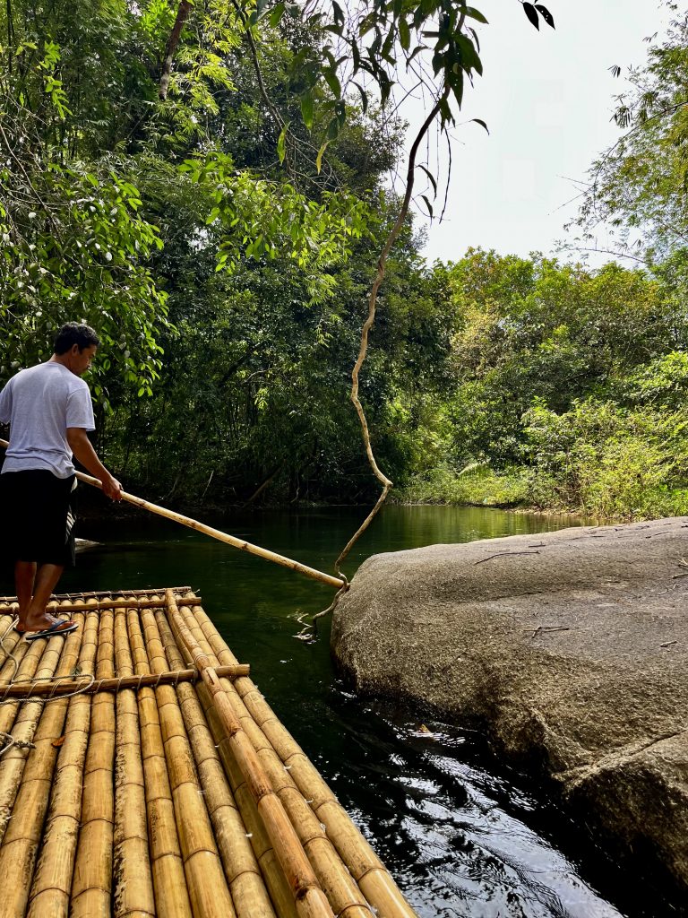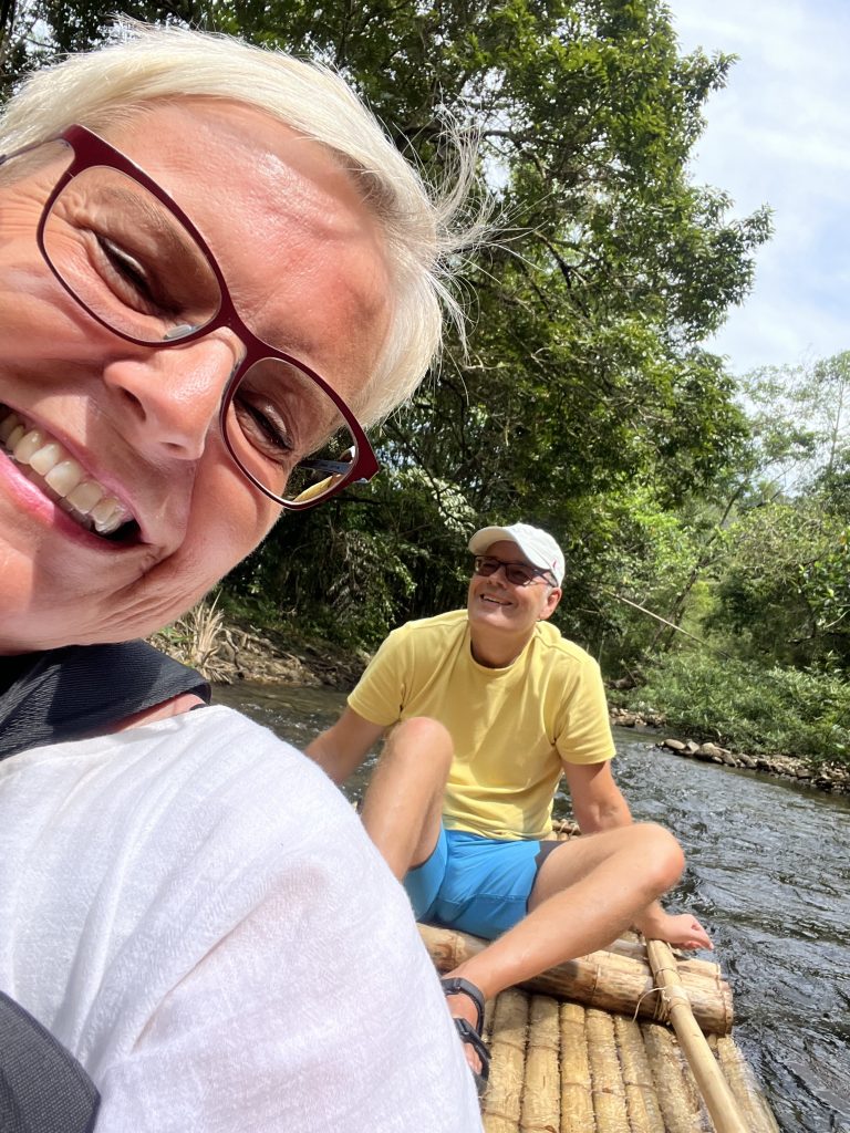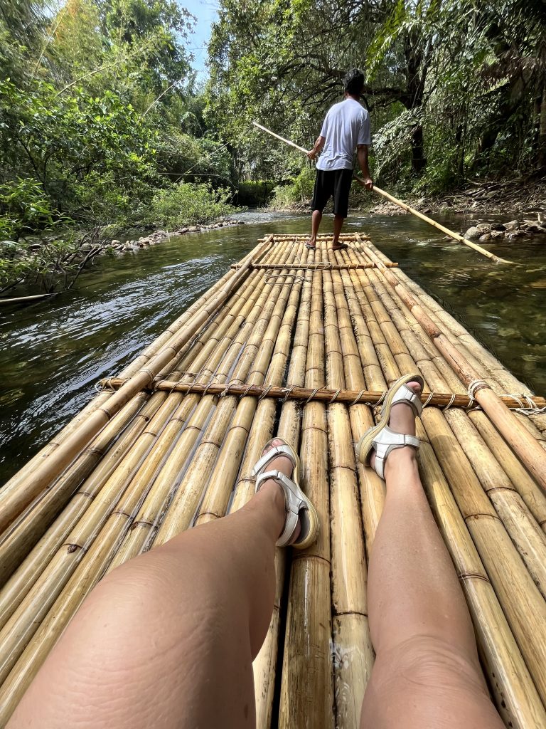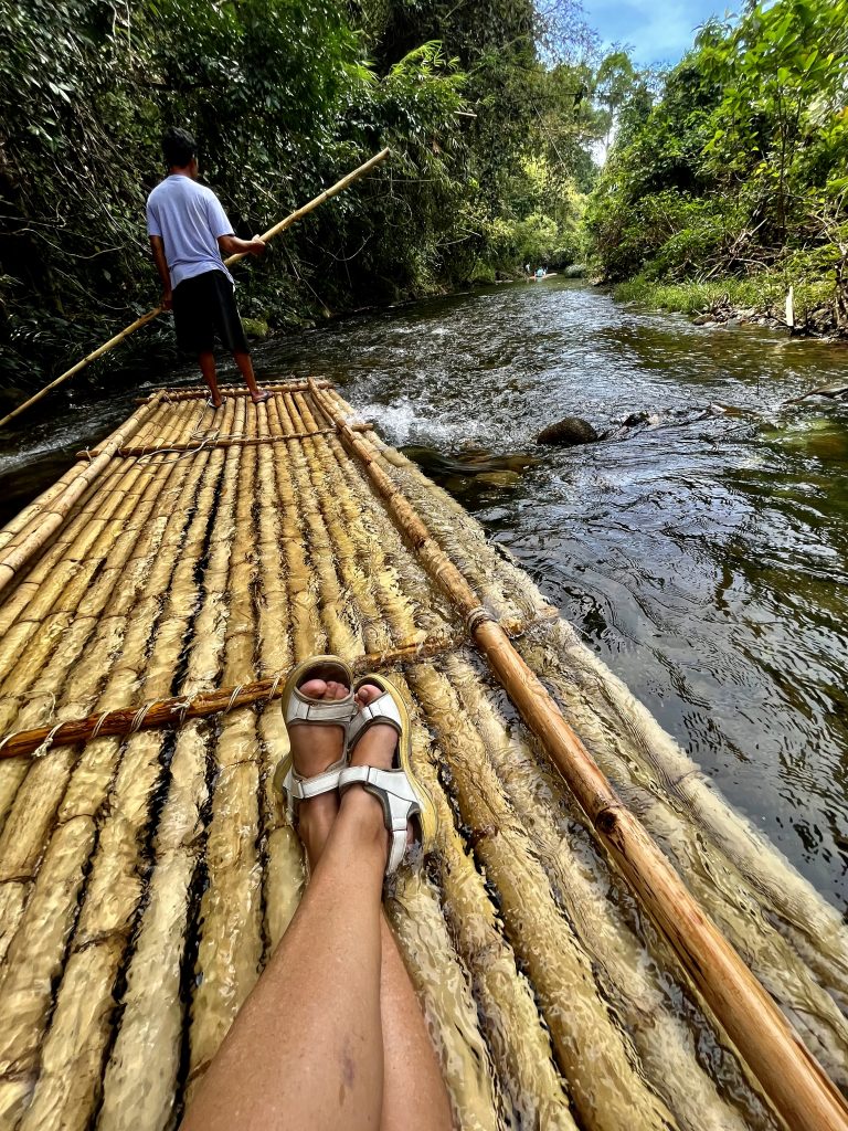 Und ehe wir uns versehen, sitzen wir auf einem Bambusfloß, begrüßen unseren Flößer und los geht die Fahrt. 😝
