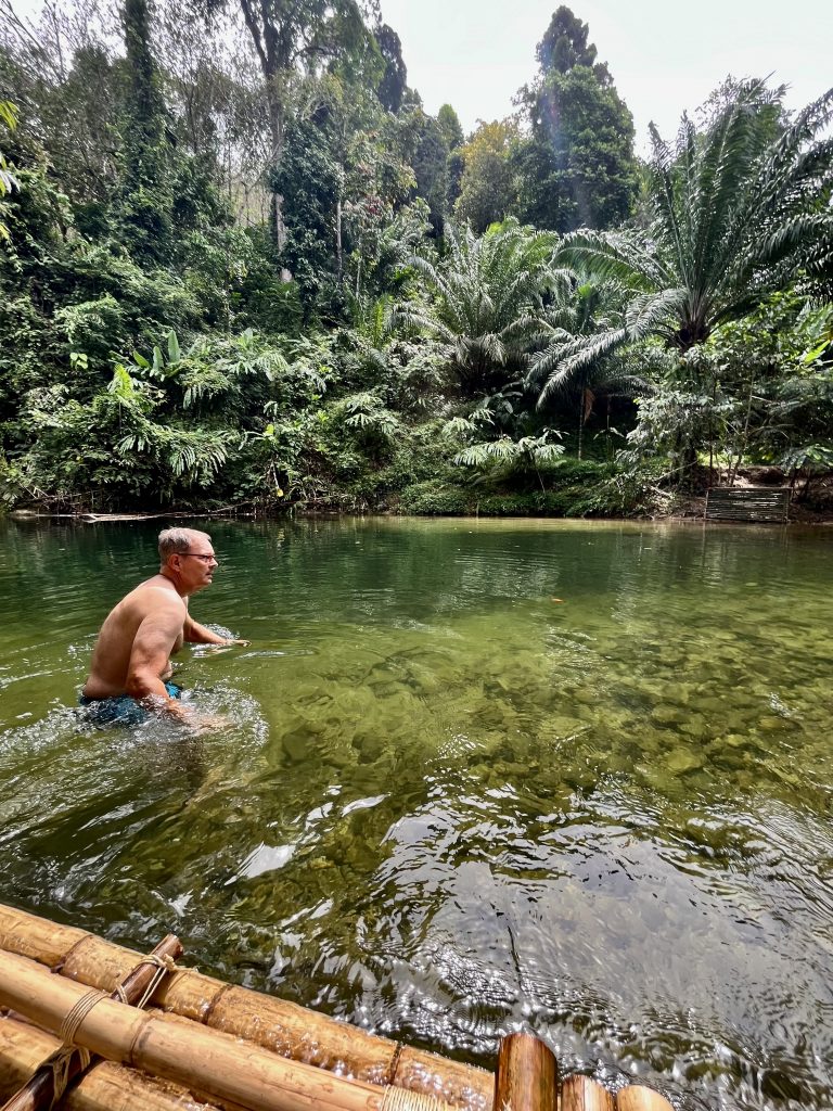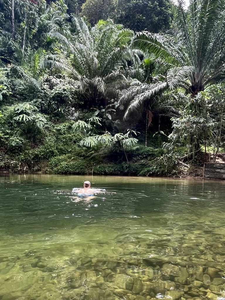 Dann, es gibt eine kleine Pause und wir dürfen schwimmen. Also runter vom Floß und rein ins erfrischende Nass. Und nein, nicht mit Schlangen und nicht mit Krokodilen 🐊! Wir haben gefragt!