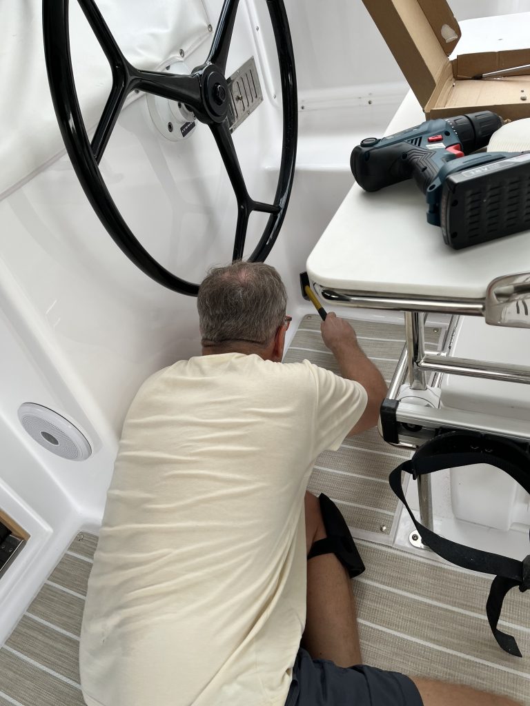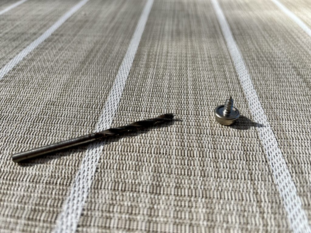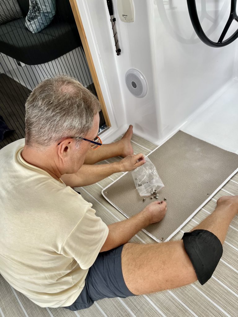 Am Ende sind wir sehr zufrieden! Löcher markieren, Bohren, Saugen, Entgraten, Saugen, Schraube mit Kleber ummanteln, Einschrauben und das Innere der Schraube mit Silikon verfüllen. Alles 52 mal … Geschafft!