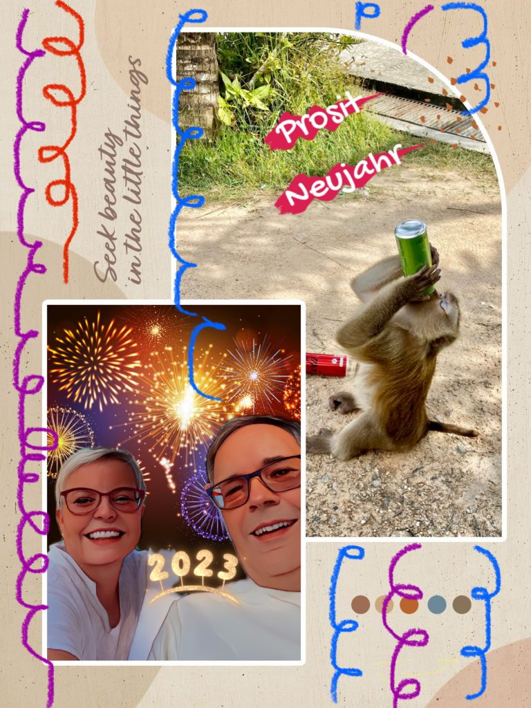 Wie kürzlich hat sich ein Trupp zum Zocken getroffen. Das geht schon seit heute Nachmittag so und Toi ist mit von der Partie. Nun ja, wir zählen die Sekunden rückwärts, 10, 9,….3,2,1, Prosit Neujahr 🎊. Wir stoßen mit Wasser an und husten uns freundlich zu. Die Kartenzockerei geht weiter. In der Ferne wird von einer Hotelanlage ein Feuerwerk abgeschossen, ganz nett.. So, wir wären dann schon mal drin, im neuen Jahr !