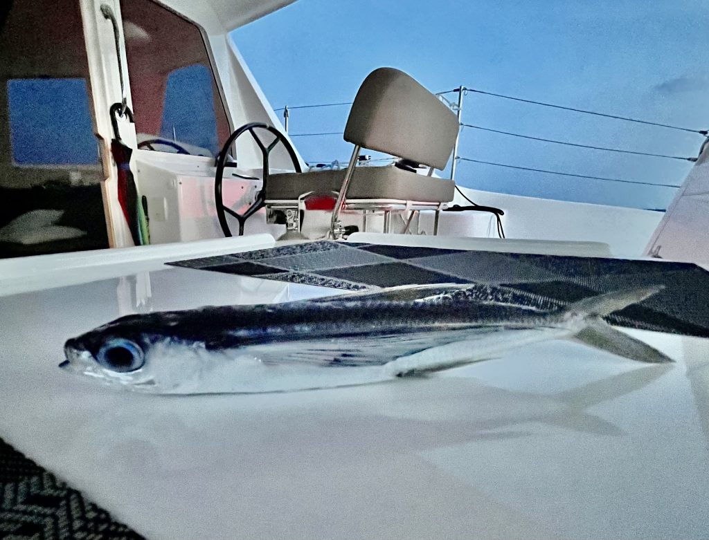 Tag 6, Freitag, 20.01.2023, Sonnenaufgang. Wir haben noch 270 Seemeilen zu bewältigen. Ich entdecke zwei größere Flugfische, verendet an Deck.