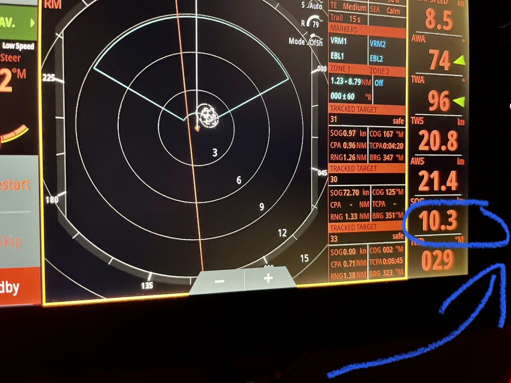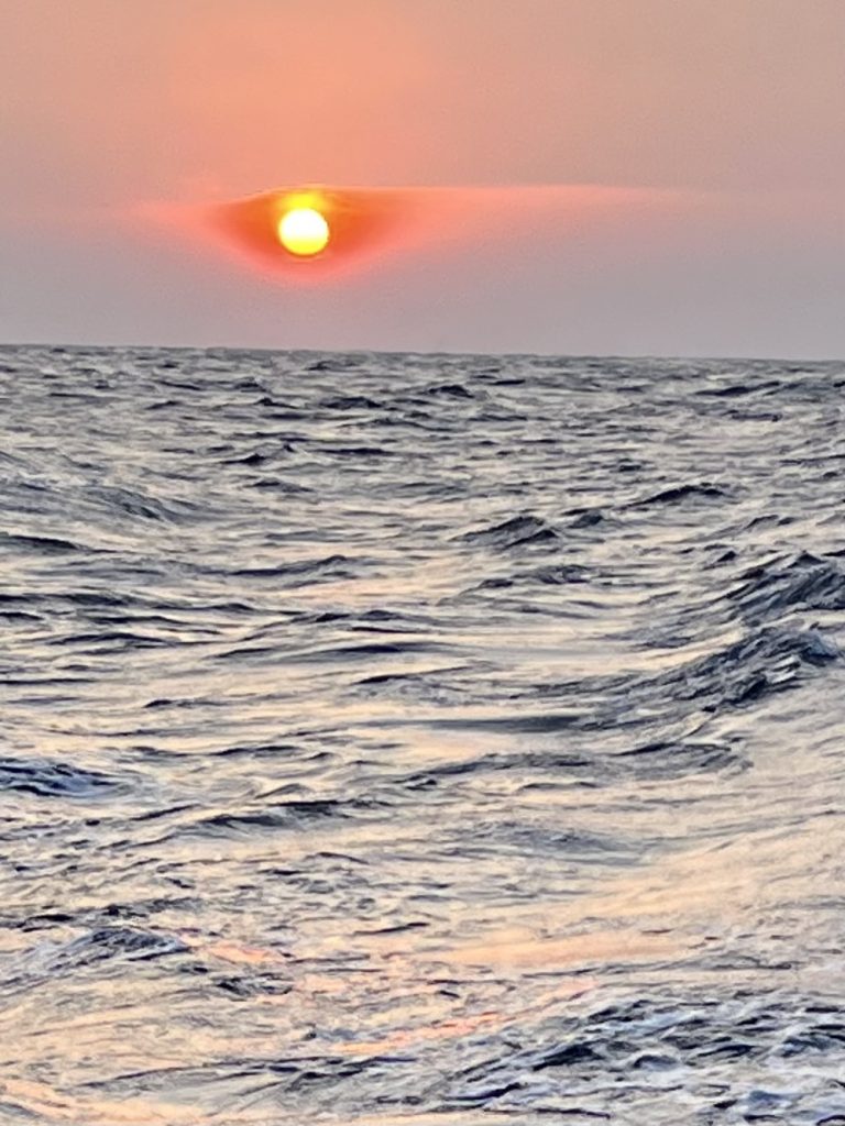 Und schon kündigt sich wieder die Dämmerung an, die Sonne ist dann mal weg und wie gehabt, frischt der Wind nochmals auf. Dööf, sehr dööf!!! Diese Nacht geht wirklich an unsere Kräfte! In der zweiten Hälfte legt der Wind nochmals zu und Böen von 26 bis 27 Knoten sind keine Seltenheit. Noch ein bisschen mehr und wir müssen das Großsegel weiter auf Reff 3 verkleinern…Auch Windrichtung und Strömung verändern sich erneut und die Bedingungen sind herausfordernd für Segelstellung, Navigation und uns! Die schlagenden Wellen klingen nun mehr wie Bomben. Sausender Wind und tosende See tun ihr Übriges. Nur gut, dass Klaus und ich recht furchtlos sind!!! Beim Anschauen der beiden Videos, sollte volle Lautstärke gewählt werden, damit der tatsächlich Lärm auch nur annähernd rüberkommt.