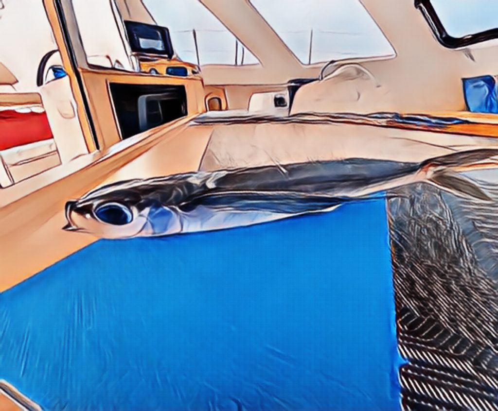 Aber erstmal finde ich heute Morgen wieder einen toten Fisch an Deck. Diesmal ist es aber ein größeres Exemplar. Leider schon ganz fest und angetrocknet. Nichts mehr zu machen.