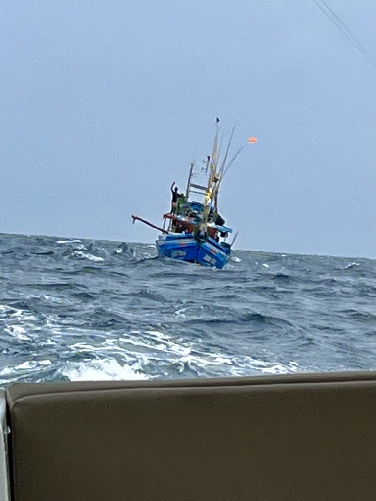 Ja, wenn schon kein Anglerglück, dann wenigstens ein Flugfisch Glück. Aber zum Essen wohl doch recht ungeeignet, da schon wieder hart und vertrocknet. Na dann zurück ins Meer… Das Boot ist mittlerweile mit einer Salzkruste überzogen. Alles ist rutschig und schmierig. Net schä! Apropos Materialtest. Es ist schon erstaunlich, was das Boot so alles aushalten muss!!! Gesund kann das nicht sein. Leider bleibt uns das unruhige Wasser, die größeren Wellen, der Wind und die gegen uns gerichtete Strömung auch tagsüber mehr oder weniger erhalten. Wenn es uns auch bei Licht besser auszuhalten erscheint. Yuti hat ordentlich Tempo drauf. 8 bis 9 Knoten sind normal. Es ist 14:45 Uhr, 200 Seemeilen vor Sri Lanka, da taucht, wie aus dem Nichts, das erste Fischerboot auf. Upsi, da hatten ja schon die Segeljungs vor uns so ihre Erlebnisse.