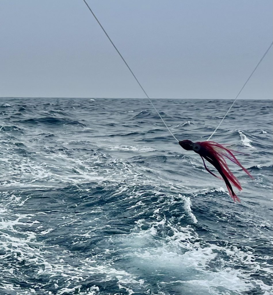 Gerne hätte ich zurück gewunken, aber wir wollen ihn nicht animieren näher zu kommen. Man weiß ja nie, was so alles passieren könnte… Wir sausen aber auch sooo schnell durch’s Wasser, dass er flott abdreht und seiner Wege tuckert. Unser Mahi Mahi Köder mag auch nicht ins Wasser, zu unruhig. Aber im Ernst, sollte jetzt, hier und heute etwas anbeißen, wir könnten es nicht reinholen, bei dem Seegang.