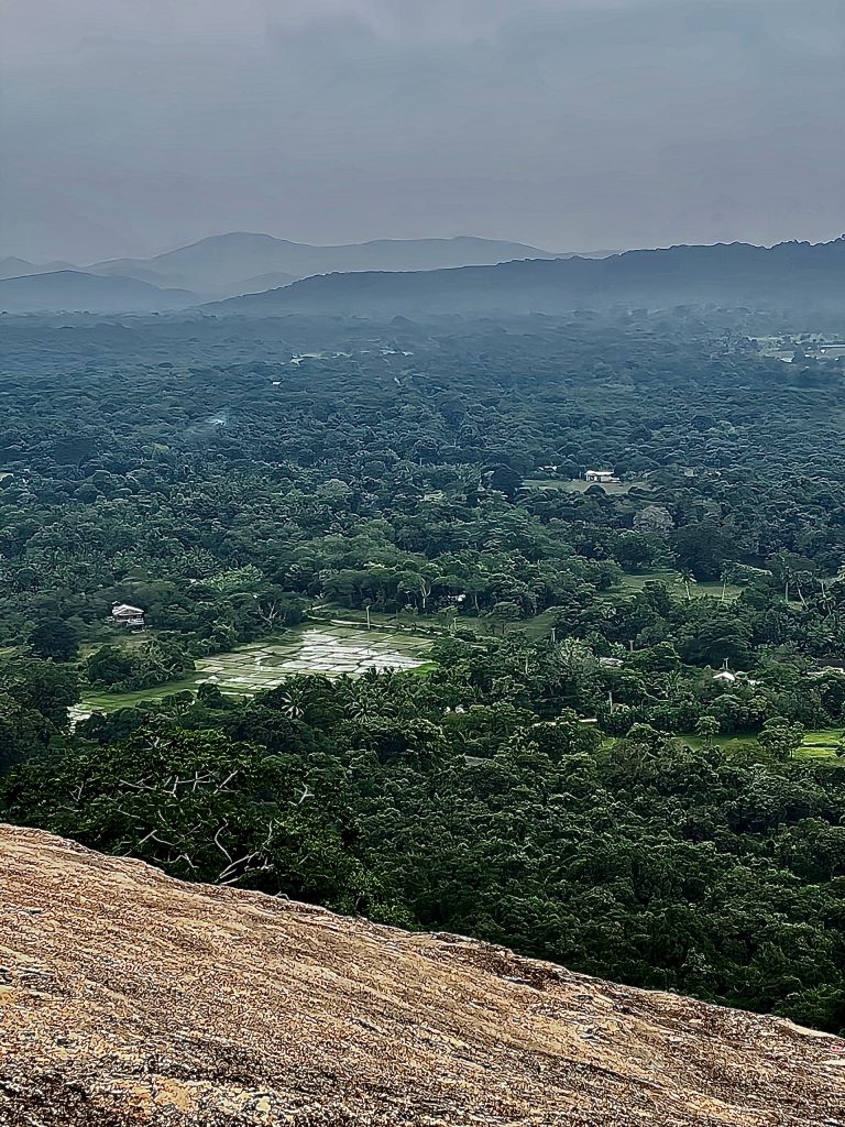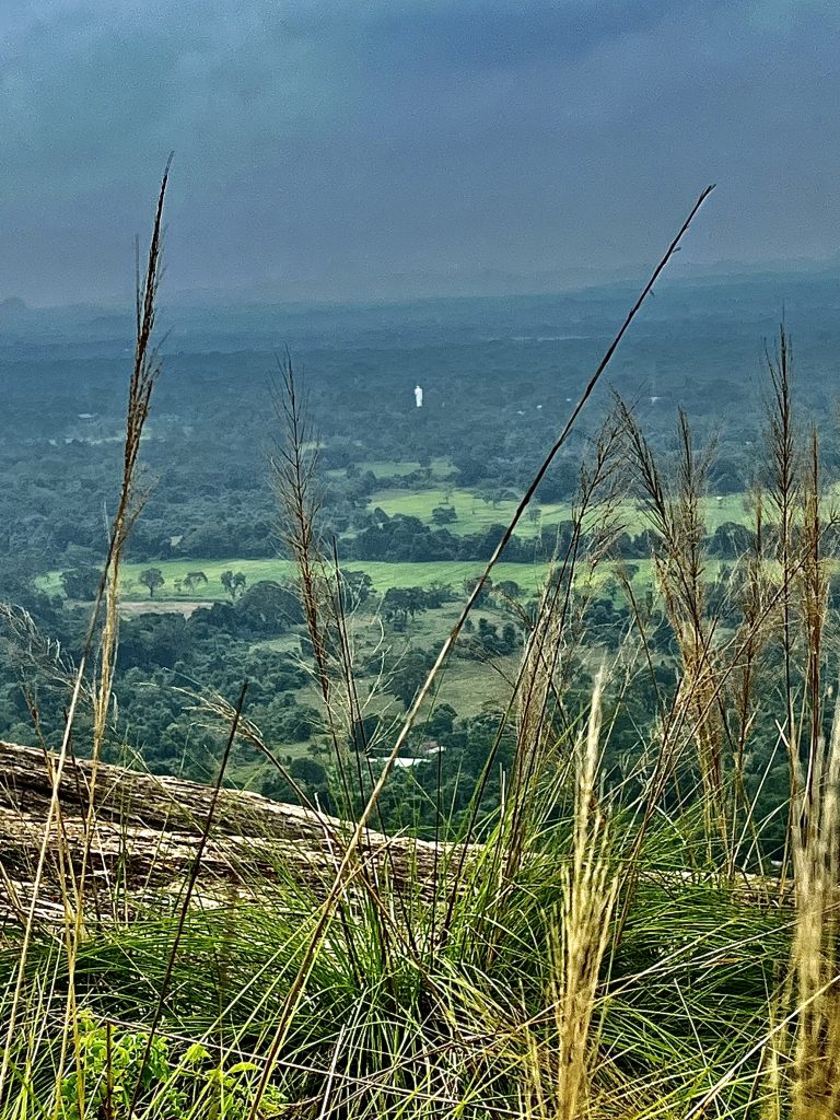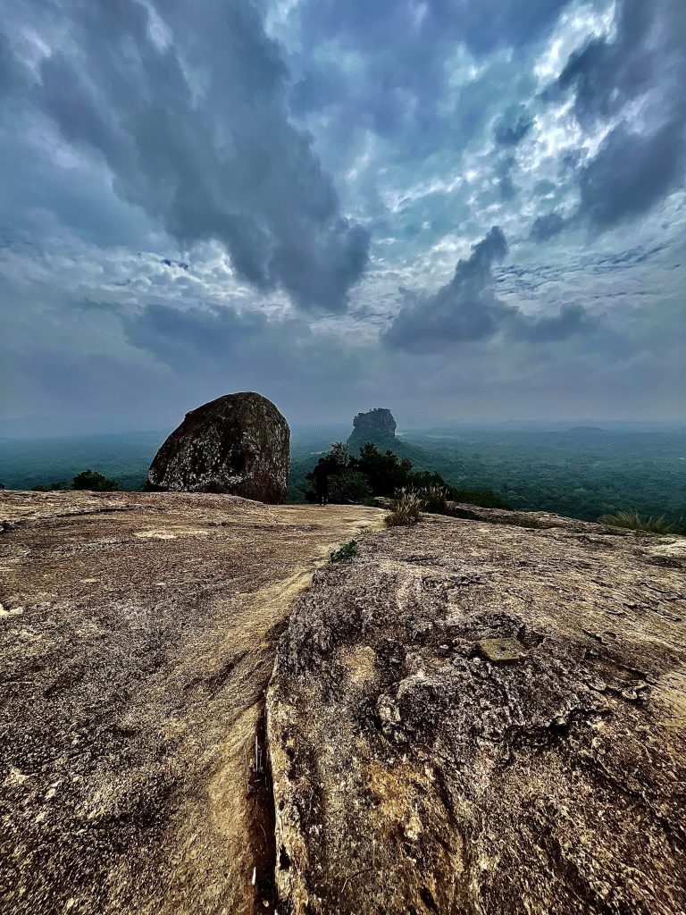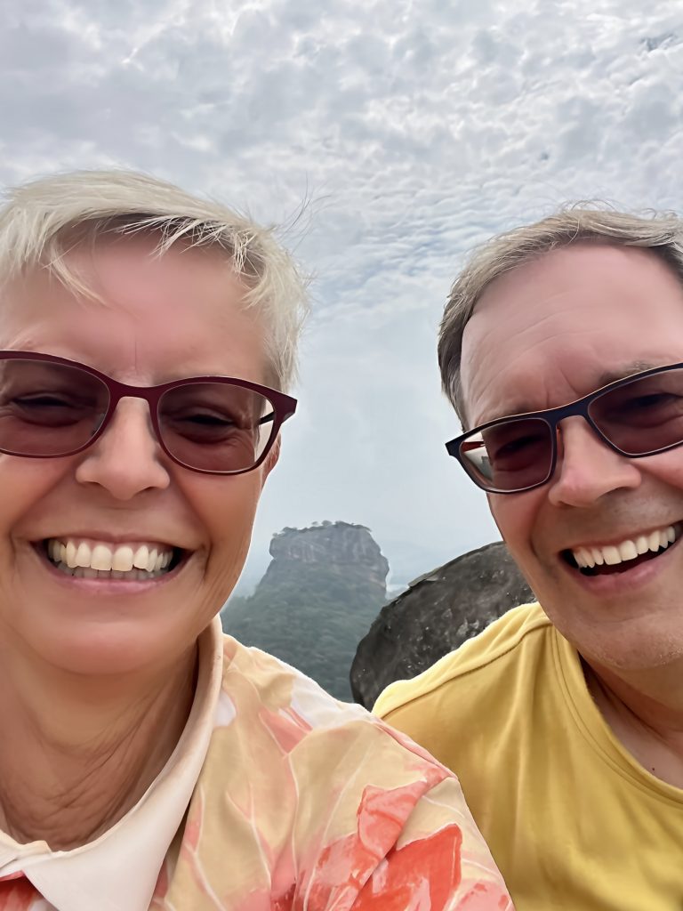 Wir kommen an eine Stelle, wo man nur mit einem langen Schrittsprung und viel Mut weiterkommt. Beides habe ich nicht. ☹️Meine Beinlänge reicht absolut nicht aus und Mut zum Sprung habe ich ebenfalls nicht. Klaus hadert auch. Zwischen den Felsen geht’s runter, ohne irgendeine Sicherung. Für mich ist‘s klar, ich bleibe hier und kann das letzt Stück halt nicht erklimmen. Bewundernd beobachte ich junge Singhalesen, die wie die Steinböcke über die Felsen springen und das mit Flip Flops!!! 😳 Hinter uns kommt eine singhalesische Familie mit zwei Söhnen im teeny Alter. Die jumpen gazellengleich hinauf, der Vater auch, nur die Mutter hat Probleme. Die zieht er dann per Hand zu sich hinauf. Oben angekommen beobachten sie unsere kläglichen Versuche und sofort streckt der Vater uns seine Hand entgegen. Klaus greift zu und ist oben. Jetzt noch mich hinaufbugsieren, geschafft. 😮💨 Was ein grandioser 360 Grad Ausblick! Bin ich froh, dass ich jetzt doch oben sein kann!!!