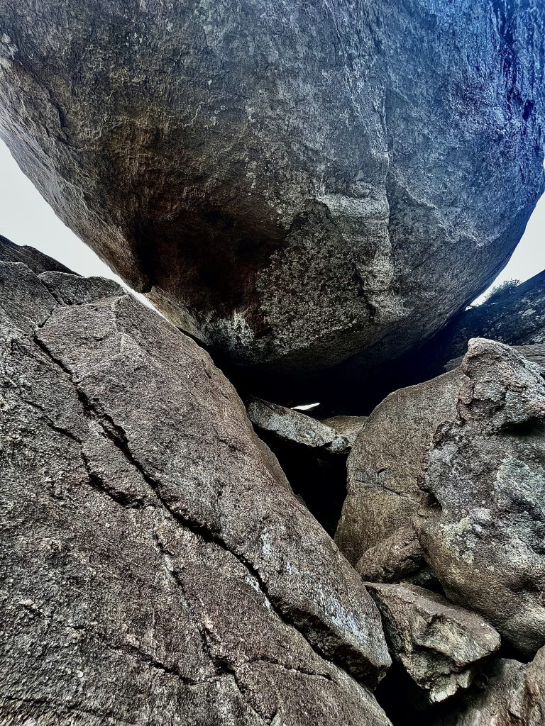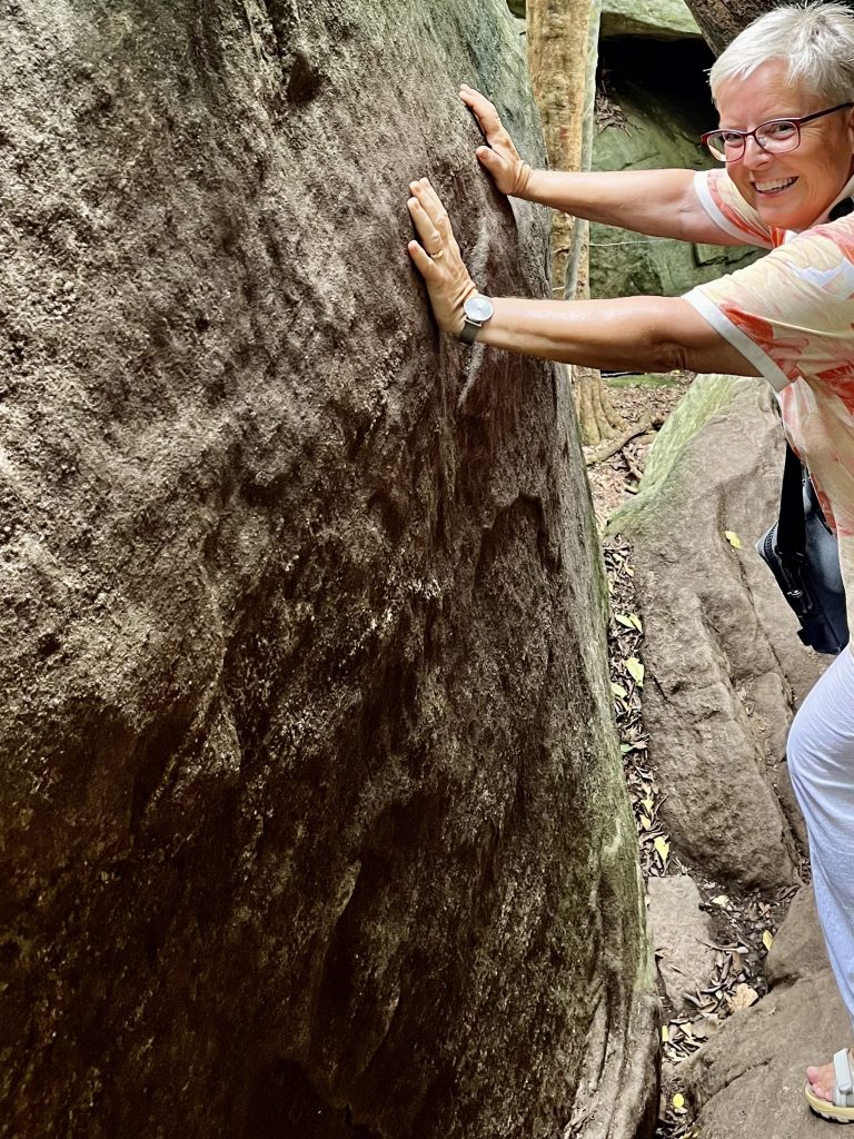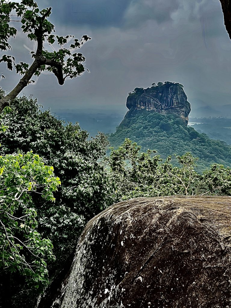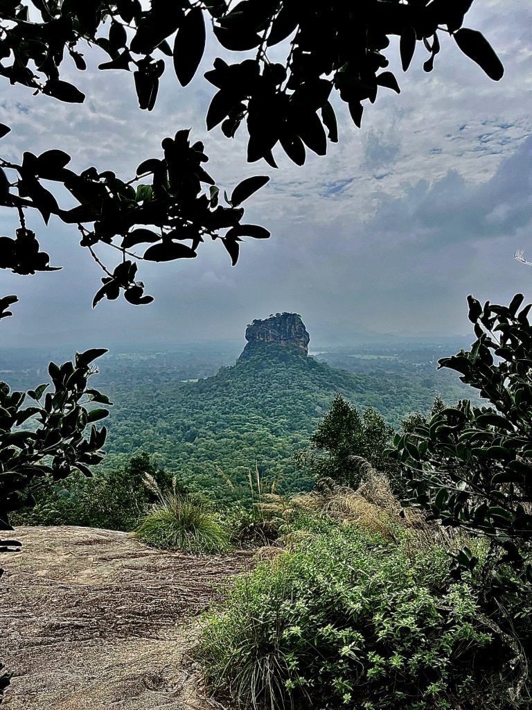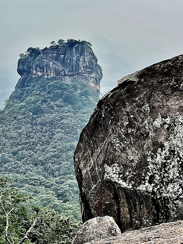 Wir kommen an eine Stelle, wo man nur mit einem langen Schrittsprung und viel Mut weiterkommt. Beides habe ich nicht. ☹️Meine Beinlänge reicht absolut nicht aus und Mut zum Sprung habe ich ebenfalls nicht. Klaus hadert auch. Zwischen den Felsen geht’s runter, ohne irgendeine Sicherung. Für mich ist‘s klar, ich bleibe hier und kann das letzt Stück halt nicht erklimmen. Bewundernd beobachte ich junge Singhalesen, die wie die Steinböcke über die Felsen springen und das mit Flip Flops!!! 😳 Hinter uns kommt eine singhalesische Familie mit zwei Söhnen im teeny Alter. Die jumpen gazellengleich hinauf, der Vater auch, nur die Mutter hat Probleme. Die zieht er dann per Hand zu sich hinauf. Oben angekommen beobachten sie unsere kläglichen Versuche und sofort streckt der Vater uns seine Hand entgegen. Klaus greift zu und ist oben. Jetzt noch mich hinaufbugsieren, geschafft. 😮💨 Was ein grandioser 360 Grad Ausblick! Bin ich froh, dass ich jetzt doch oben sein kann!!!