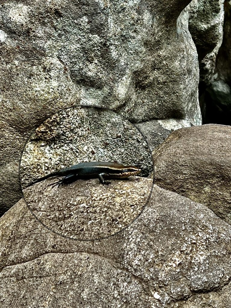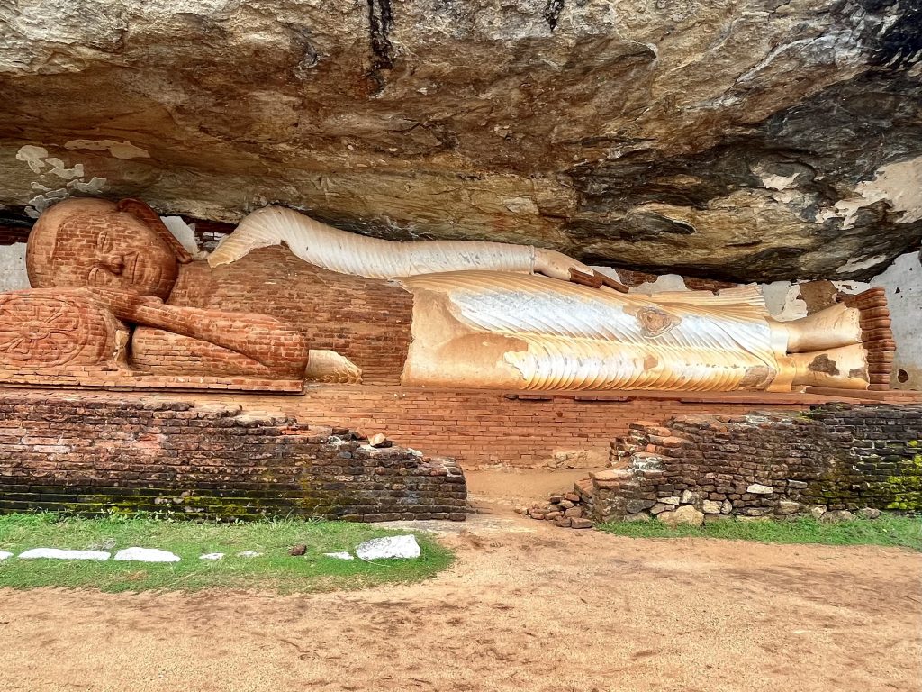 Sigiriya heißt die Gegend und ist nur 20/30 km von unserem Safaripark entfernt. Yusuf hat noch Zeit und will uns hinfahren. Super! Auf geht’s. Die Frage ist nur, besuchen wir den Löwen oder lieber den etwas kleineren Bruder, den Pidurangala? Der Tag ist ja schon zur Hälfte rum und vielleicht reicht die Zeit nicht FÜR den Löwenfelsen. Allahopp, wir fahren zum Pidurangala. Dort haben wir dann den tollen Blick AUF den Löwen. Ach, da sind wir ja auch schon. Kurze Frage an Yusuf, ob unser Schuhwerk -Wandersandalen- okay geht? Ja ja, sind ja nur Treppenstufen, wenn auch viele! Gut! Auf geht’s! Wir bezahlen 1.000,- Rupien pro Person, durchschreiten -barfuß selbstverständlich – den buddhistischen Tempel am Fuße des Monolithen und erklimmen die ersten Stufen. Kurze Verwirrung wo es weitergeht, dann finden wir den richtigen Aufstieg. An die 1.000 Stufen könnten es schon sein. 😅 Ein junges, britisches Pärchen kommt uns entgegen und Klaus fragt mal schnell, wie weit es noch sei? Die Antwort ist eine andere. Die letzten 50 Meter seien etwas schwierig, die Treppen hören auf und man müsse klettern. Ein kurzer Blick auf uns, ja, wir könnten es schaffen…. Oh weia! 😬Hätten wir uns doch besser für den Löwenfelsen entscheiden sollen? Zu spät! Weiter erklimmen wir Stufe für Stufe und passieren erst einmal einen liegenden Buddha.
