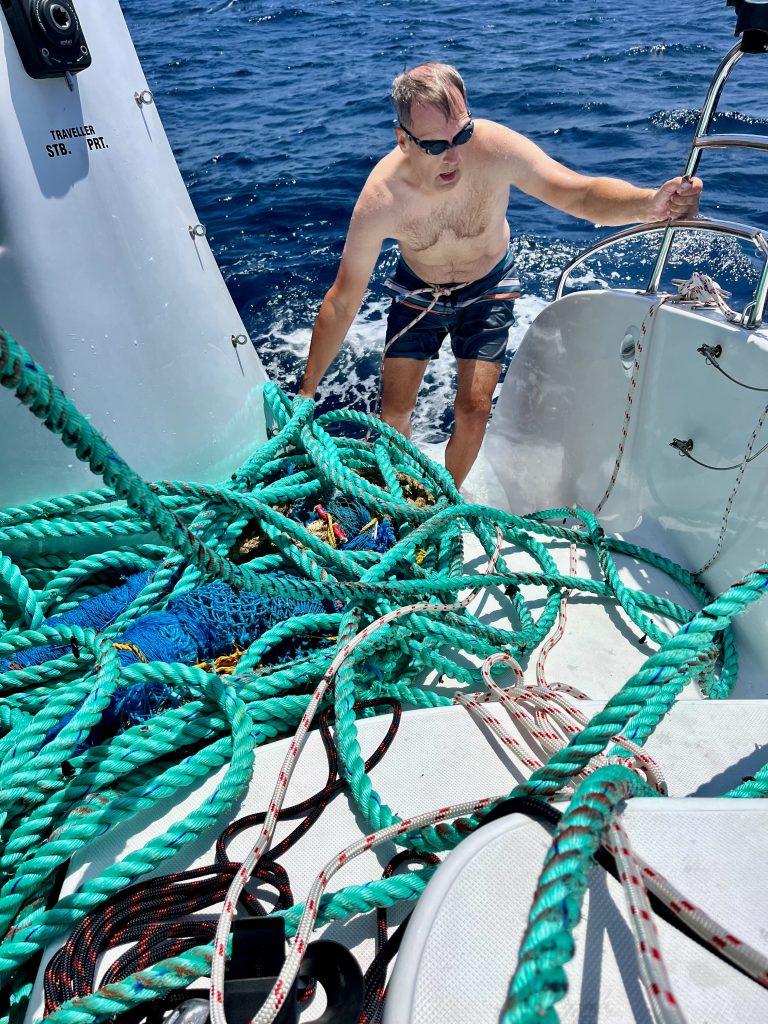 Und nun? Was machen wir jetzt mit dem Salat? Wir enttüddeln und wickeln es auf. Das dauert übrigens 1 1/2 Stunden! Wir sind echt geschafft, haben dafür aber zwei riesen, gewickelte Haufen. Toll! 🙄 Was sollen wir jetzt damit machen??? Wir haben nirgends Platz, um dieses Monstrum zu lagern. Und unser Boot ist jetzt noch schwerer… Wir sind schon mehr als an unserer Gewichtsgrenze dran, auch persönlich. 🤭 Diskutier hin, diskutier her, ich bin fürs über Bord schmeißen. Klaus tut sich schwer. Das ist mindestens 300,- Euro wert und für die Umwelt ganz schlecht. Stimmt! Aber so können wir an Bord nicht mehr ungehindert agieren und hantieren, wenn dieses Ungetüm irgendwo liegt. Und das ist dann für uns gefährlich! Also gut. Mit schwerem Herzen geben wir es der See zurück. Diesmal aber gewickelt und fest verknotet. So kann es sich wenigstens nicht mehr um etwas herumwickeln. Vielleicht findet es so ein Fischer und kann es gebrauchen…