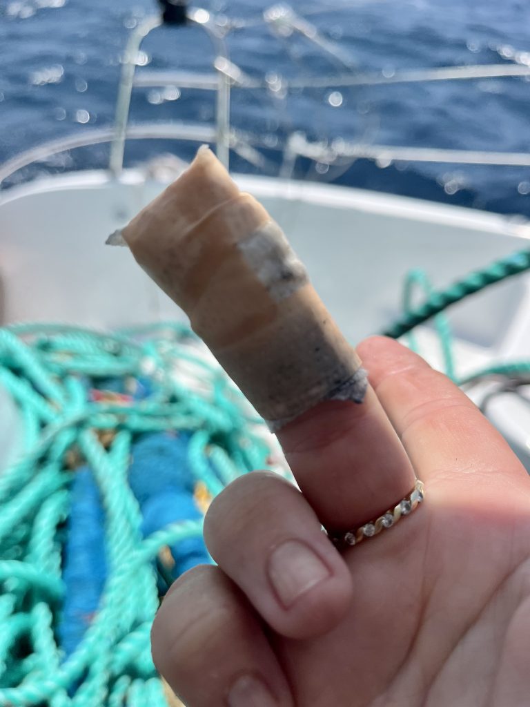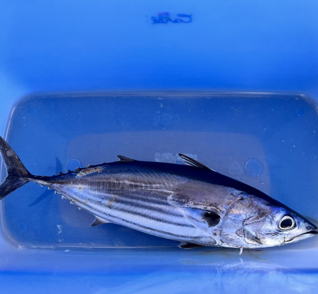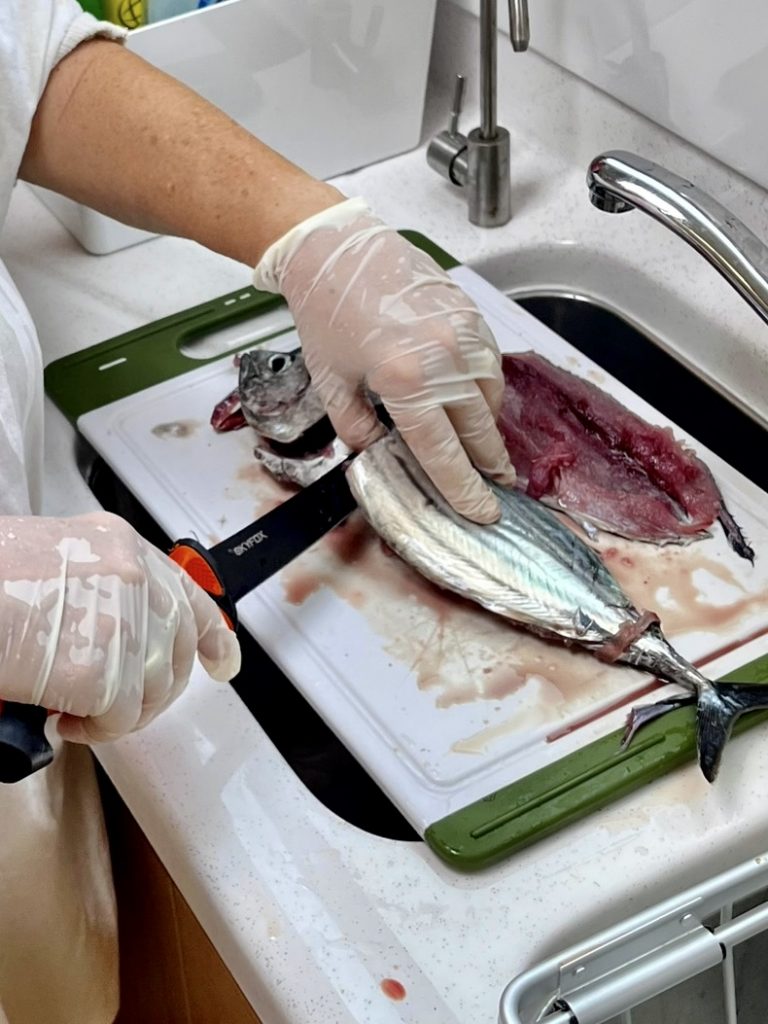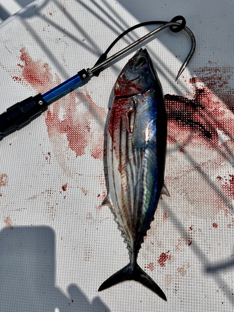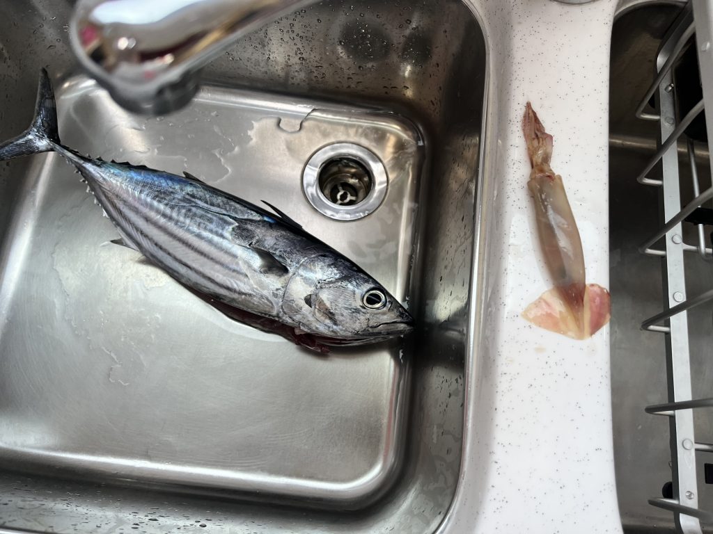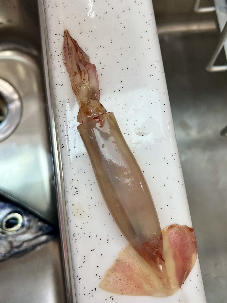 Na, da will ich mich mal wieder ans ausnehmen machen. Und was finde ich im Tunabauch? Einen völlig unverdauten Tintenfisch 🦑. Den hat er wohl kurz bevor er unseren Tintenfischköder geschnappt hat, verschlungen.