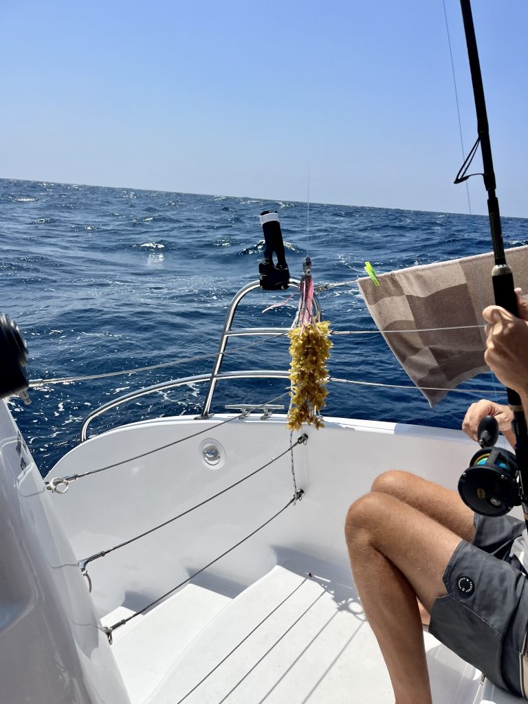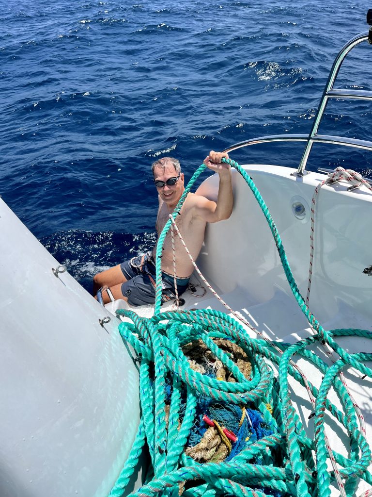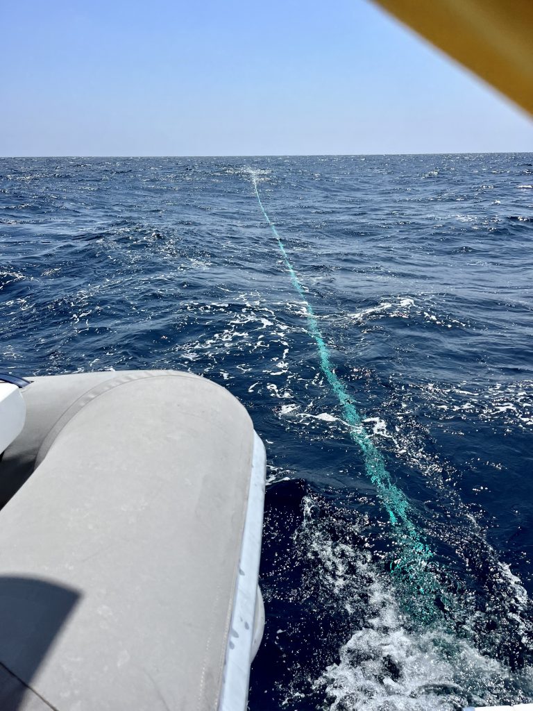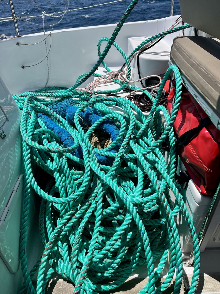 Die am Morgen rausgehängte Angel schlägt Alarm. Ein Fisch?? 🐟Wir springen hin…. , ach du meine Güte, was ist DAS denn? Wir schleppen eine mindestens 100 Meter lange, fette, türkise Schwimmleine hinter uns her.