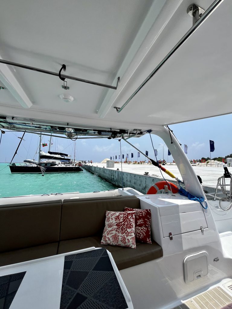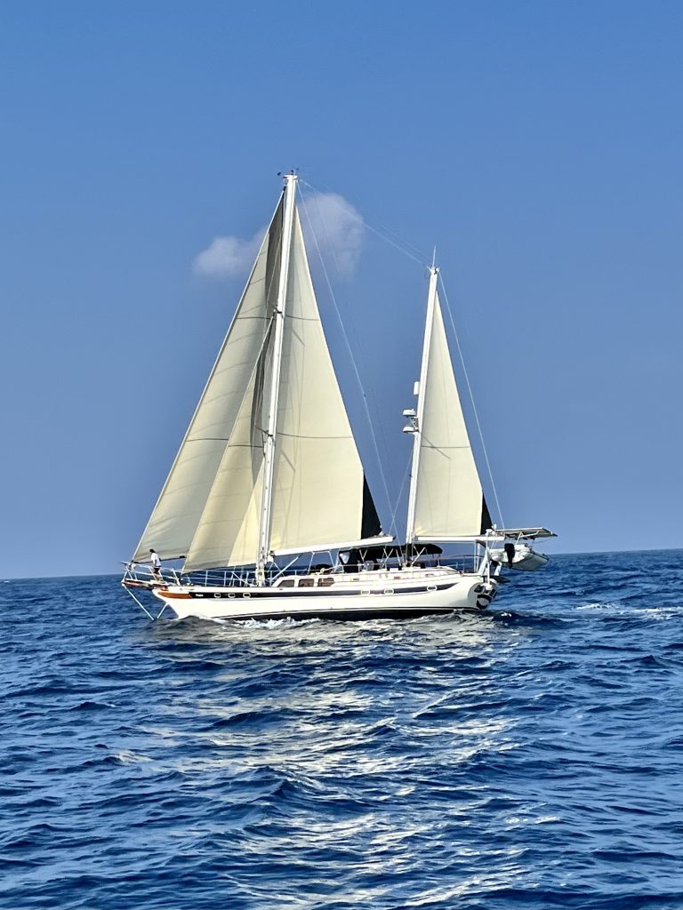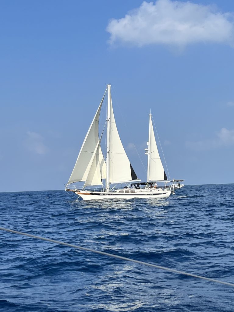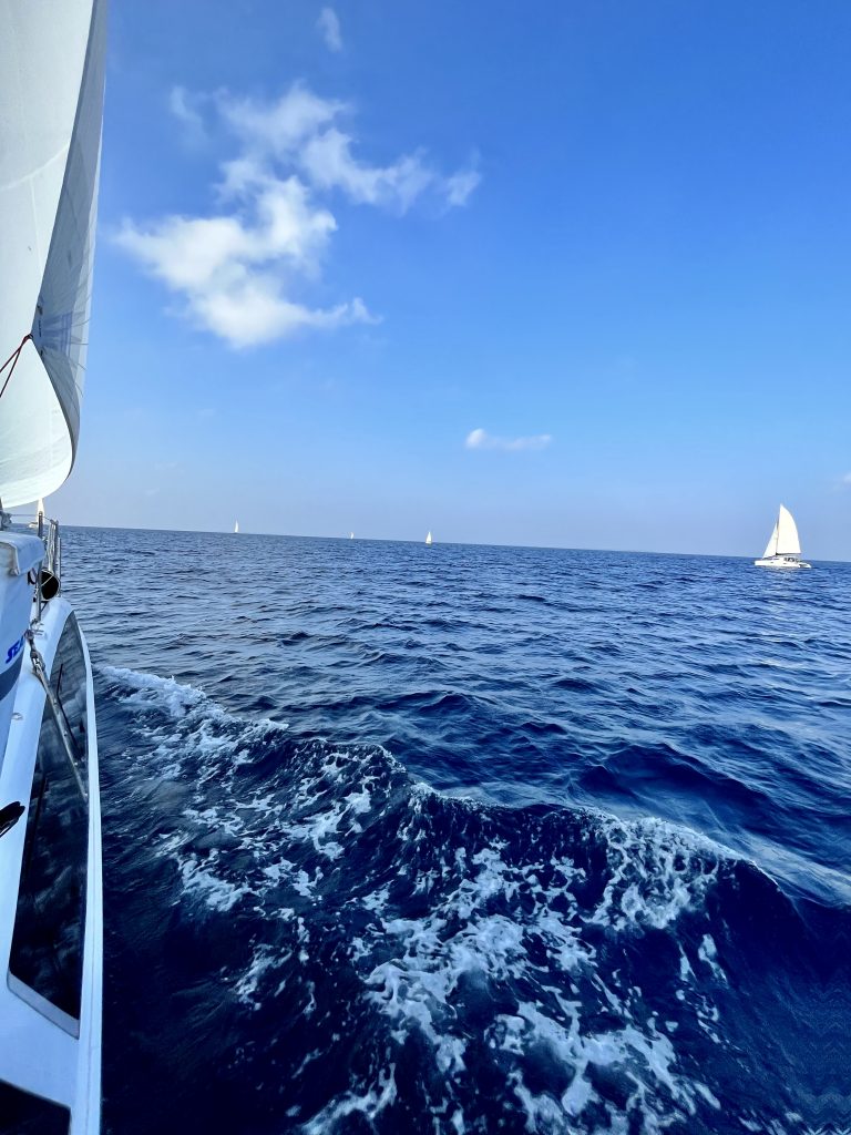 Den ersten Kat zur Rechten haben wir fast⊠đ So geht es weiter und weiter. Yuti durchschneidet mit ihren schlanken Hulls und Kielen, ihrer Leichtigkeit und den tollen Segeln elegant und geschmeidig das Wasser. Super!!! Nach einer 1 Stunde haben wir 10 Boote ĂŒberholt, aber sowas von locker⊠đđ Wenige Minuten spĂ€ter haben wir das 11. im Sack! Das macht SpaĂ, Regattafeeling kommt auf. đ Wer sind die letzten beiden vor uns? NatĂŒrlich die Ăsterreicher und der EnglĂ€nder. Ein Wettkampf unter EuropĂ€ern beginnt. Toll ist, wir haben sie schon mal im Blick. Yuti ist klasse! Als hĂ€tte sie Feuer unterm Hintern saust sie durch die Wellen. Wir kommen unaufhaltsam nĂ€her und nĂ€her. YippieeeeeâŠ. Wir glauben es kaum, aber wir kommen tatsĂ€chlich ran. Wir trimmen die Segel so gut es geht, aber Yuti macht das schon. Unglaublich aber wahr, zack, da haben wir die Ăsterreicher. Tschakka! Wir segeln 9,5 Knoten am Wind, der Adrenalinpegel steigt, das Traumschiff des EnglĂ€nders kommt in Reichweite.