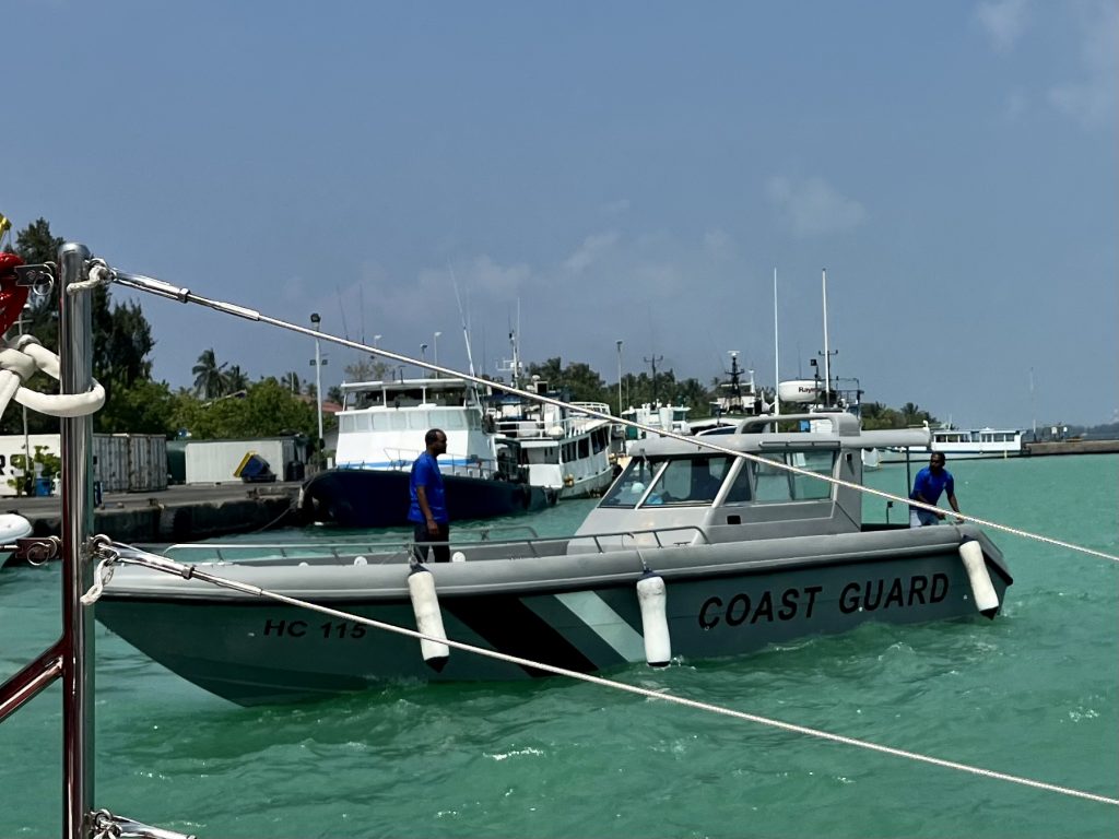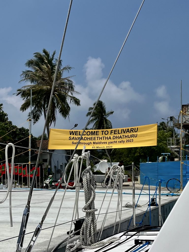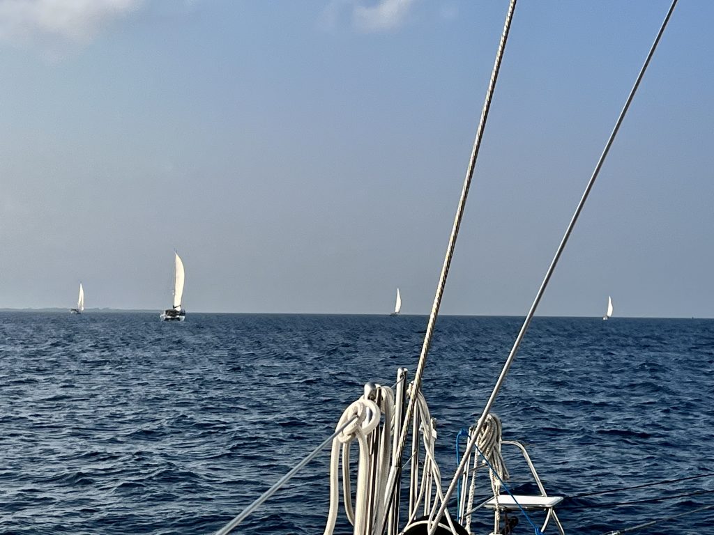 Es geht los! Nachdem wir uns nochmal von Nashfa verabschiedet und versprochen haben, in Kontakt zu bleiben, verlassen die ersten Boote den Hafen von Landhoo. Unser Lieblingspolizist Ibrahim, löst vom Polizeiboot aus die Mooringleinen von Boot zu Boot. Wir verlassen als Drittletzte den Hafen und haben 13 Boote als weit entferntes Feld vor uns. Na da haben wir jetzt aber zu tunâŠ