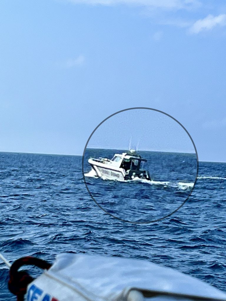 Um 9:13 Uhr haben wir das 13. Boot verdrĂ€ngt und liegen auf Platz 1! Ein Boot von 19 Metern LĂ€nge, zwei Masten und vier gesetzten Segeln, unglaublich. Aber noch sind wir nicht am Ziel von der gut 25 Meilen langen Strecke. Zwei Stunden Segeln liegen noch vor uns. Aber es lĂ€uft halt. Die Perspektive hat sich total verĂ€ndert. Wir fĂŒhren nun das Feld an und vor uns fĂ€hrt die KĂŒstenwache als Wegweiser.