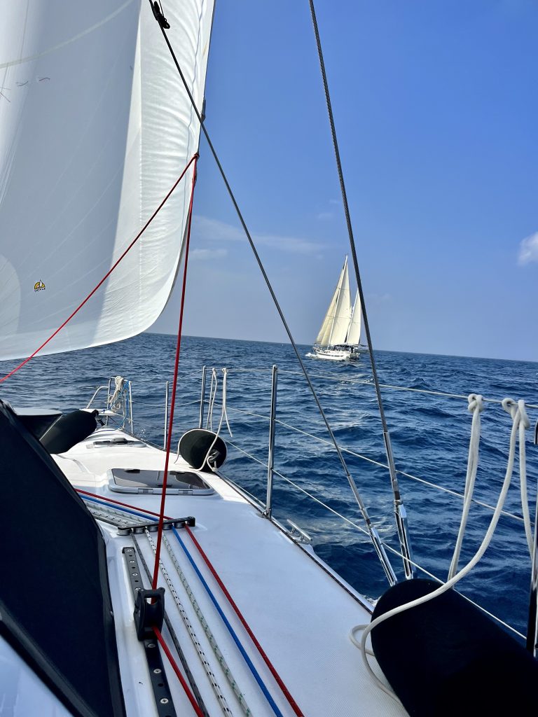 Tristan versucht noch uns abzudrĂ€ngen, so dass wir ihn nicht backbords ĂŒberholen können und er dann nicht in unseren Windschatten gerĂ€t. Klappt aber nicht⊠đ Wir ziehen locker vorbei.