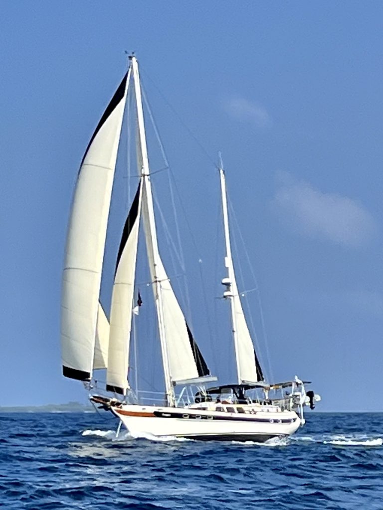 Margit sitzt neben Klaus und erzĂ€hlt uns, das Hubert, ihr Mann, erstmal googeln musste, was wir ĂŒberhaupt fĂŒr ein Boot haben, dass SIE ĂŒberholen konnteâŠZzzz. Wir haben viel SpaĂ. Auch Tristan steht die Fassungslosigkeit noch ins Gesicht geschrieben. So ein kleiner âBilligkatâ hat seinen Luxus-Windjammer in den Schatten gestellt. Na ja, er ist halt so schwerâŠ.